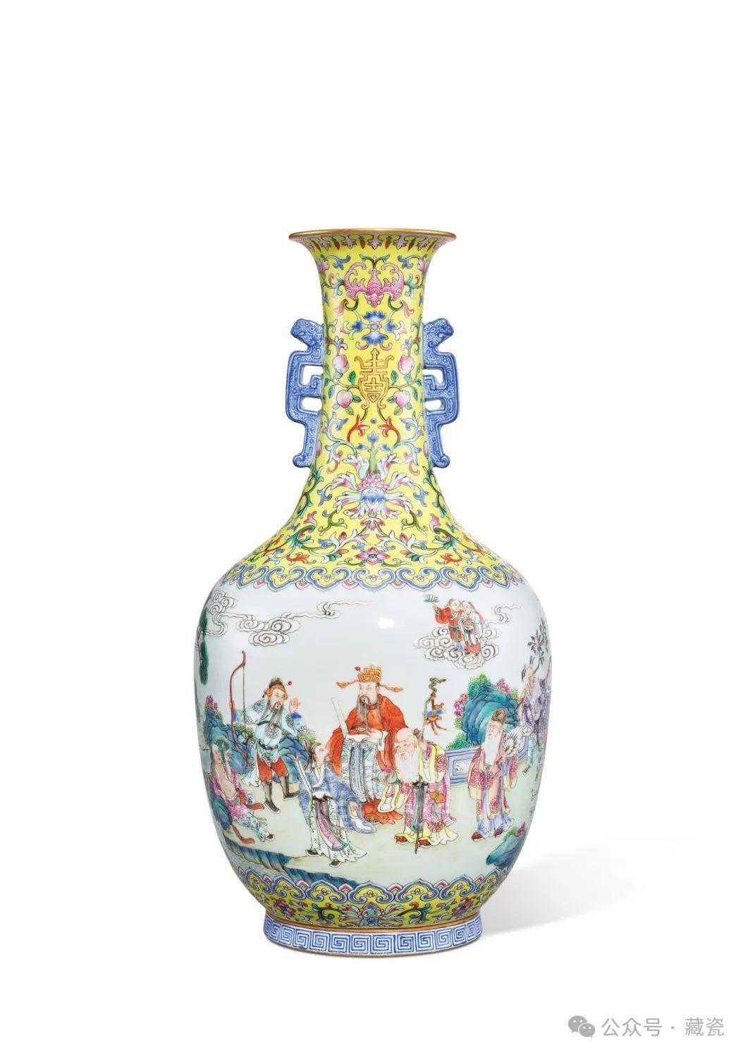 Lot3666清嘉庆黄地粉彩通景群仙祝寿图双耳瓶