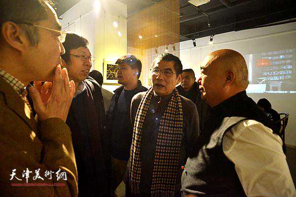 尹沧海、白鹏、马驰、林德谦在展览现场交谈。