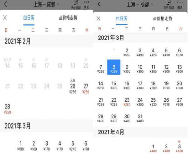 几天前,旅客搜索各大订票平台,可以发现有不少低于1折的“白菜价”机票,比如上海飞三亚最低只要129元、上海飞成都最低只要145元、上海飞贵阳最低只要75元、上海飞沈阳最低只要79元,这些价格甚至低于从机场打车前往市区的车费。但3月2日记者再搜索时,部分日期的机票价格甚至已经是此前查看时的4倍。