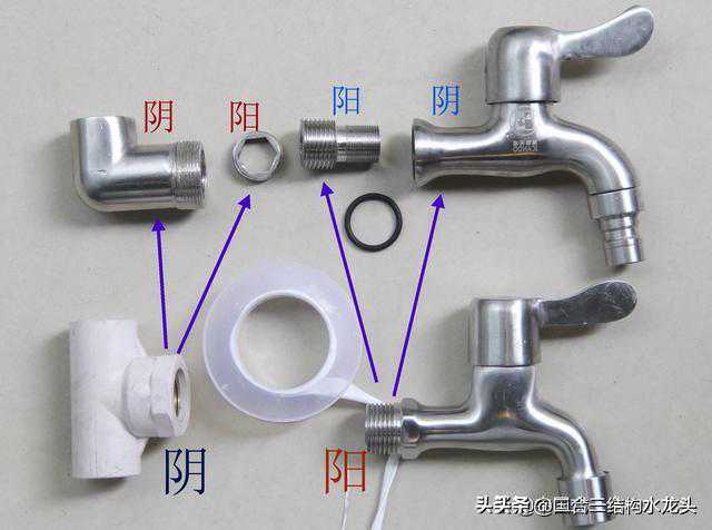 传统冷热两用水龙头,主体为阴(内螺纹),编织软管为阳.