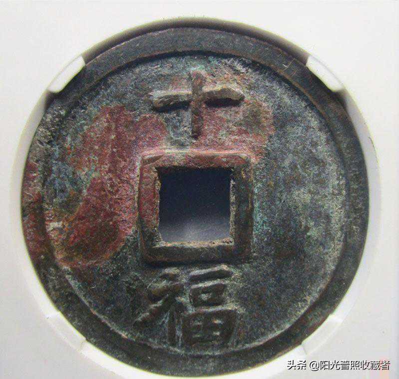 下为85分明.洪武通宝背十福评级币,尺寸:45.3x3。红斑绿绣精美异常。成交价格20760元。