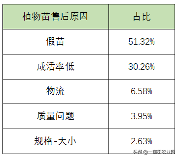 植物苗售后原因植物苗中最严重的售后原因是假苗,其次是低成活率且商家不予赔付、物流、病害质量问题等。