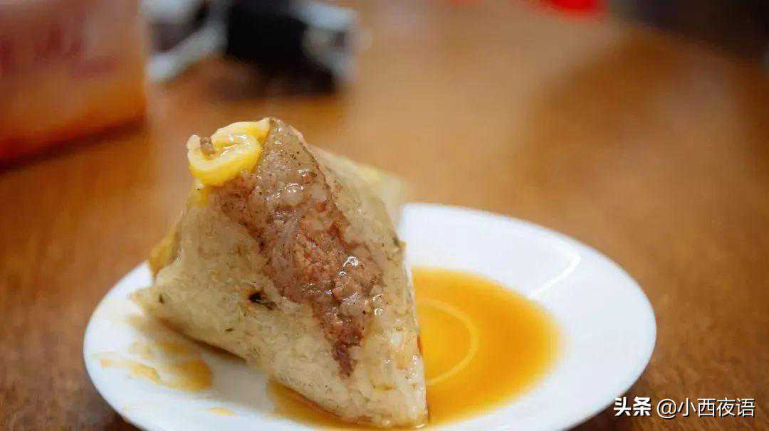 一个粽子里包含有咸甜两种材料。粽球是咸料,偏要淋了糖浆来食用。配一碗热腾腾的大肠头咸菜汤,两者配起来当早饭似乎也不错。