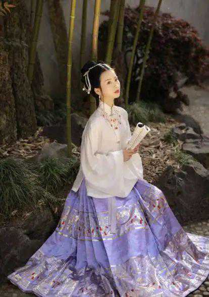 乍一眼看上去,马面裙和百迭裙十分相似,因为两者裙身上皆有不打褶的长方形区域,只不过马面裙上不打褶的区域叫裙门,在百迭裙那里叫做光面,这种不打褶的长方形区其实都叫做马面,但是为了区分百迭裙和马面裙分别用光面和裙门代替!