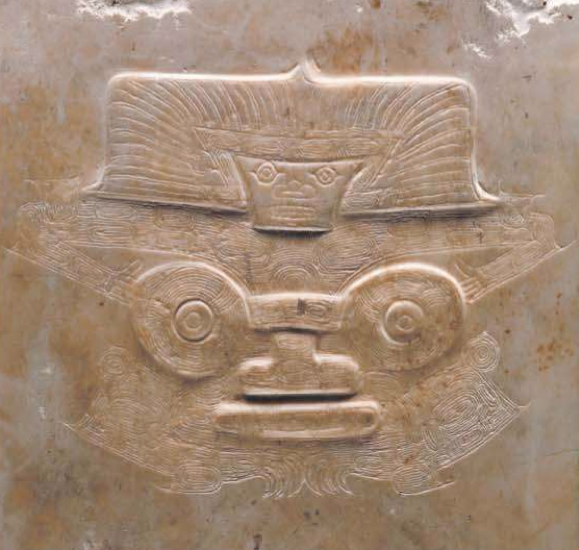 瑶山墓地出土玉牌饰上简化的人神兽面纹,《中国史前艺术》内页插图。