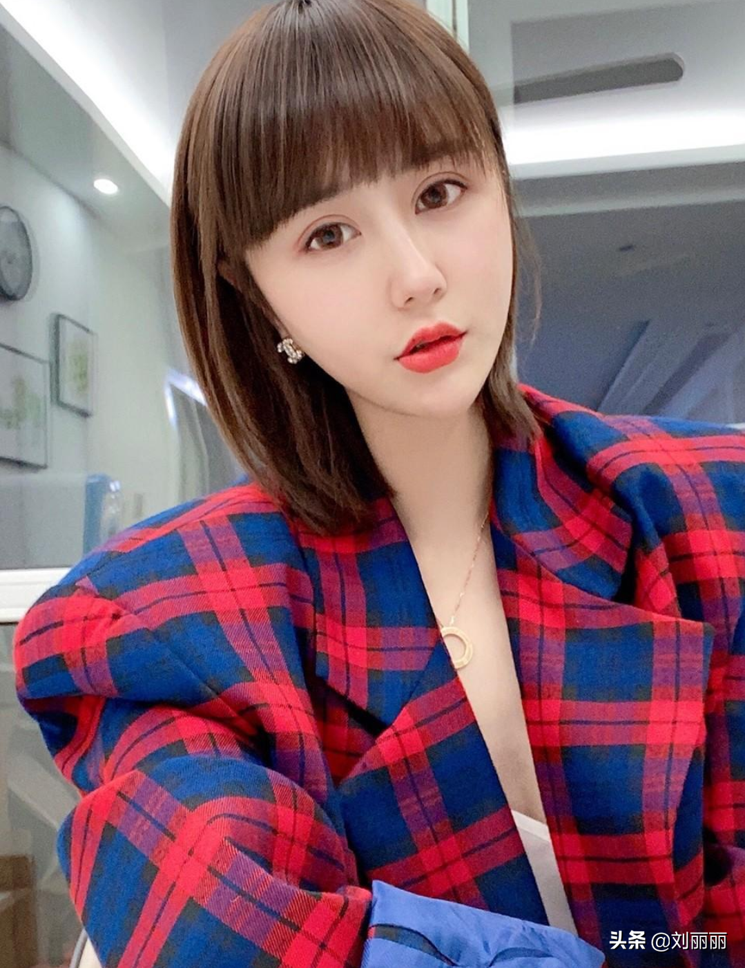 锁骨发搭配漫画刘海,一看就很美,看似整齐的刘海,却留有一点点缝隙,显得不那么厚重,柔和不呆板,齐眉的长度把人们的视线拉到一双迷人的眼睛上面,双眼皮高鼻梁樱桃小嘴搭配格子上衣,想不美都难。