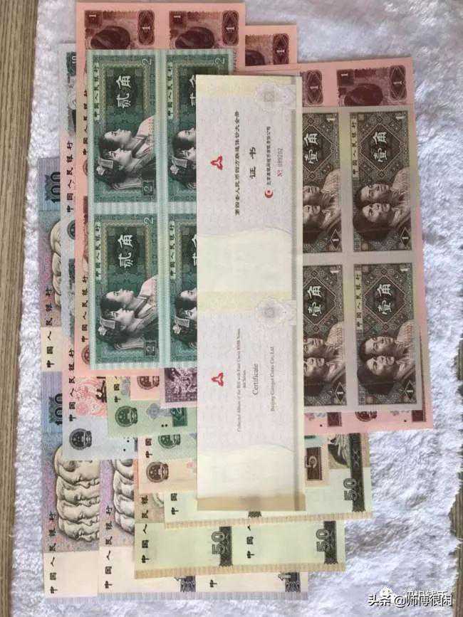 最大特点是齐全,集齐第四套人民币发行的所有版别,包括80版1、2、5角,80版、90版、96版1元,80版、90版2元,80版5元,80版10元,90版、80版50元,90版、80版100元四连体各一张,且不同面值相应单张号码相同,被简称为全同号,同一面值四张纸币号段相连简称全连号,另所有券别后四位号码和证书的后四位号码相同。