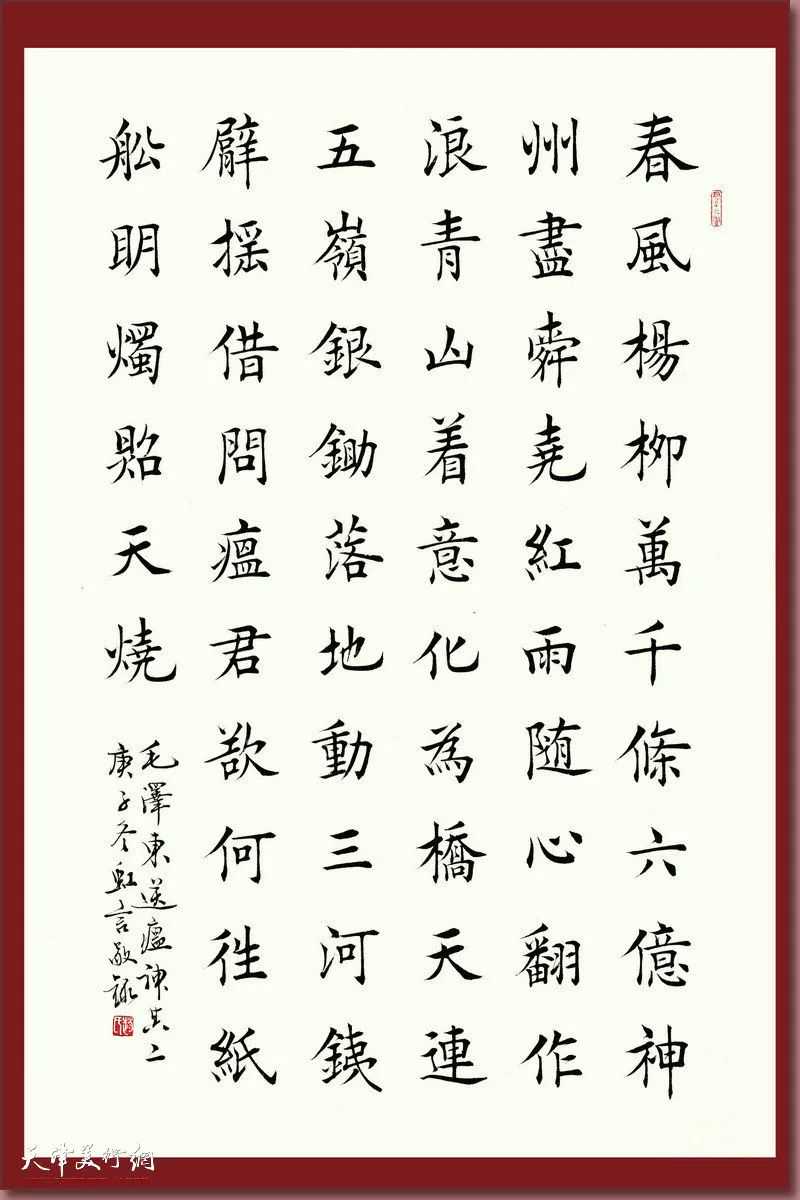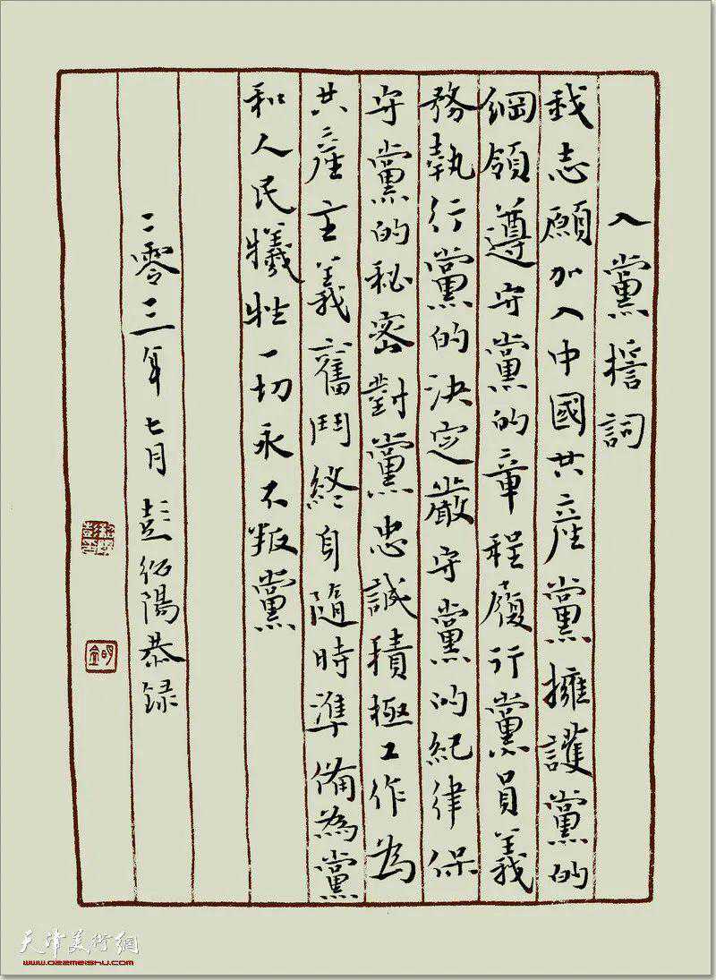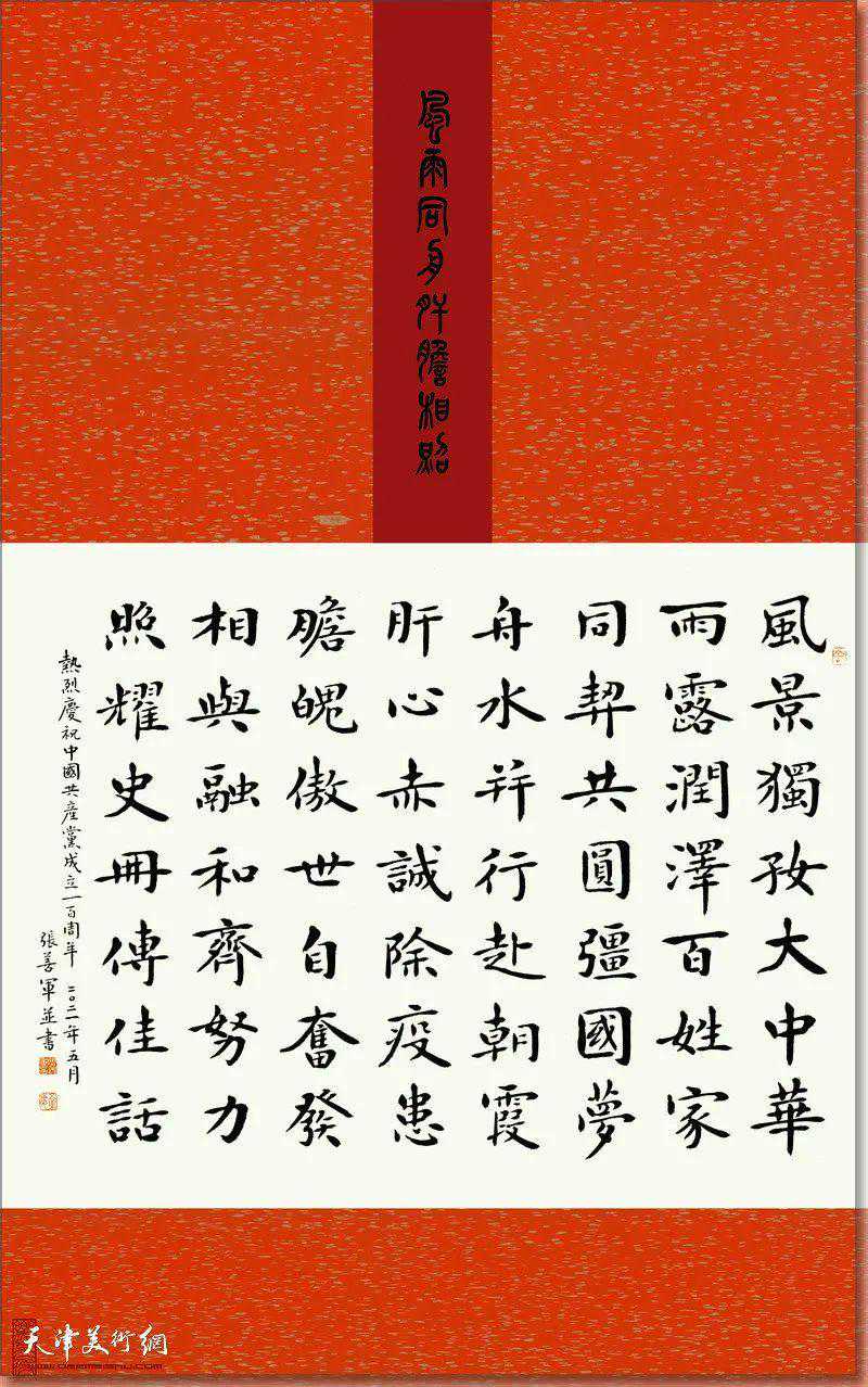 为庆祝中国共产党成立100周年,展示中国共产党百年来的革命历程,天津市书法家协会楷书委员会在天津市书法家协会的指导下,精心创作了一批集思想性、艺术性、观赏性,弘扬主旋律的优秀作品。以网络展览的形式在天津美术网隆重推出“红心向党——天津市书法家协会楷书委员会书法精品展”。展览多角度地讴歌了党的丰功伟绩、伟大祖国的巨大变化、人民生活的美好,抒发了书法家们爱党爱国的赤子情怀。