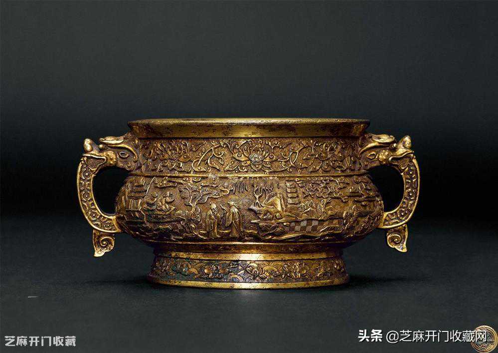 2:清乾隆铜鎏金錾花人物故事双耳炉,尺寸:直径11.5厘米,成交价:RMB3,335,000