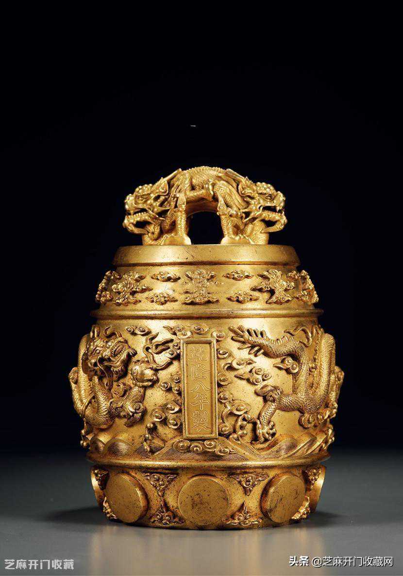 3:清乾隆御制乾隆八年款夷则铭铜鎏金交龙钮钟,尺寸:高21.5厘米;直径16.5厘米,成交价:RMB3,335,000