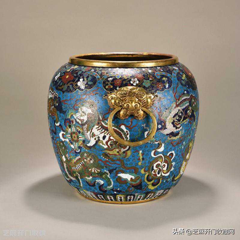 5:明晚期铜胎掐丝珐琅狮子戏球纹铺首大缸,尺寸:高34.2厘米,成交价:RMB3,220,000
