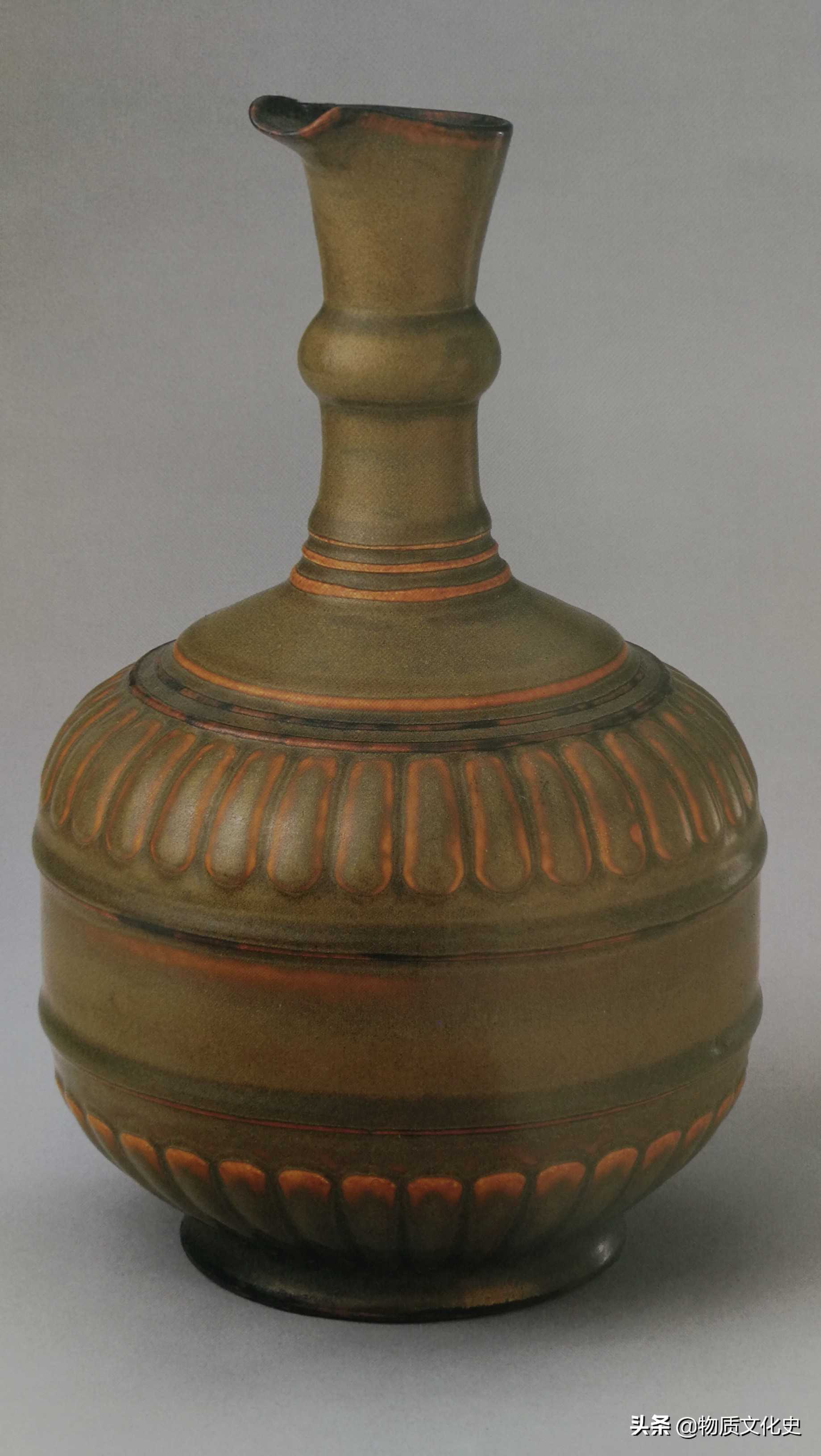 厂官釉花浇,清雍正时期所制,高26厘米,口径4.9厘米,足径8.8厘米。清宫旧藏。花浇直口,口一面有流,长颈,颈中间凸起呈球状,溜肩、直腹,腹下斜收至底,圈足。通体及足内均施厂官釉,釉呈黄褐色。颈、肩相接处凸起弦纹三道;腹上部有变形倒垂莲瓣纹,腹下部有变形仰莲瓣纹,两层莲瓣纹间以二道凸起弦纹相隔。足内有阴刻“雍正年制”四字双行篆书款。