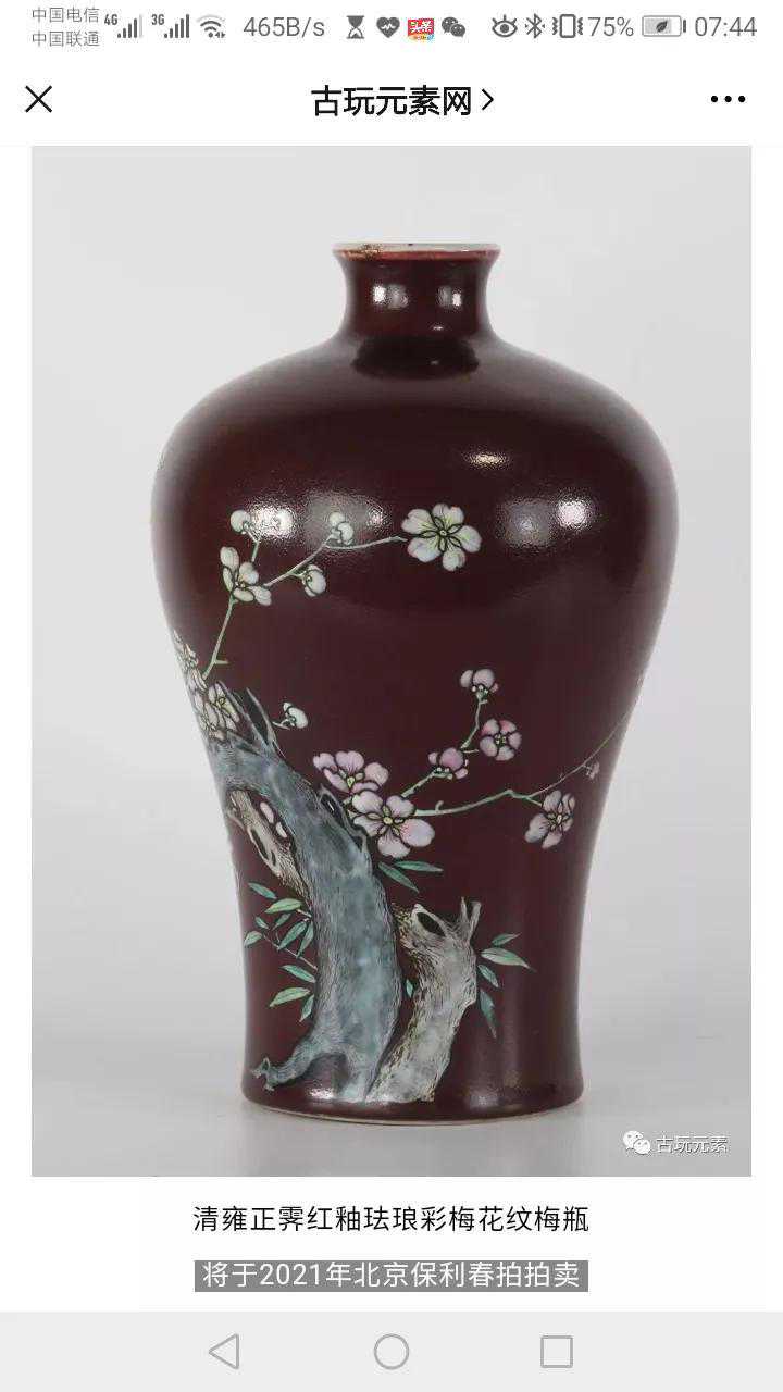 最近看到一篇文章,保利在热炒一个祭红釉梅瓶,估计是从国外买回来的,请看下图:
