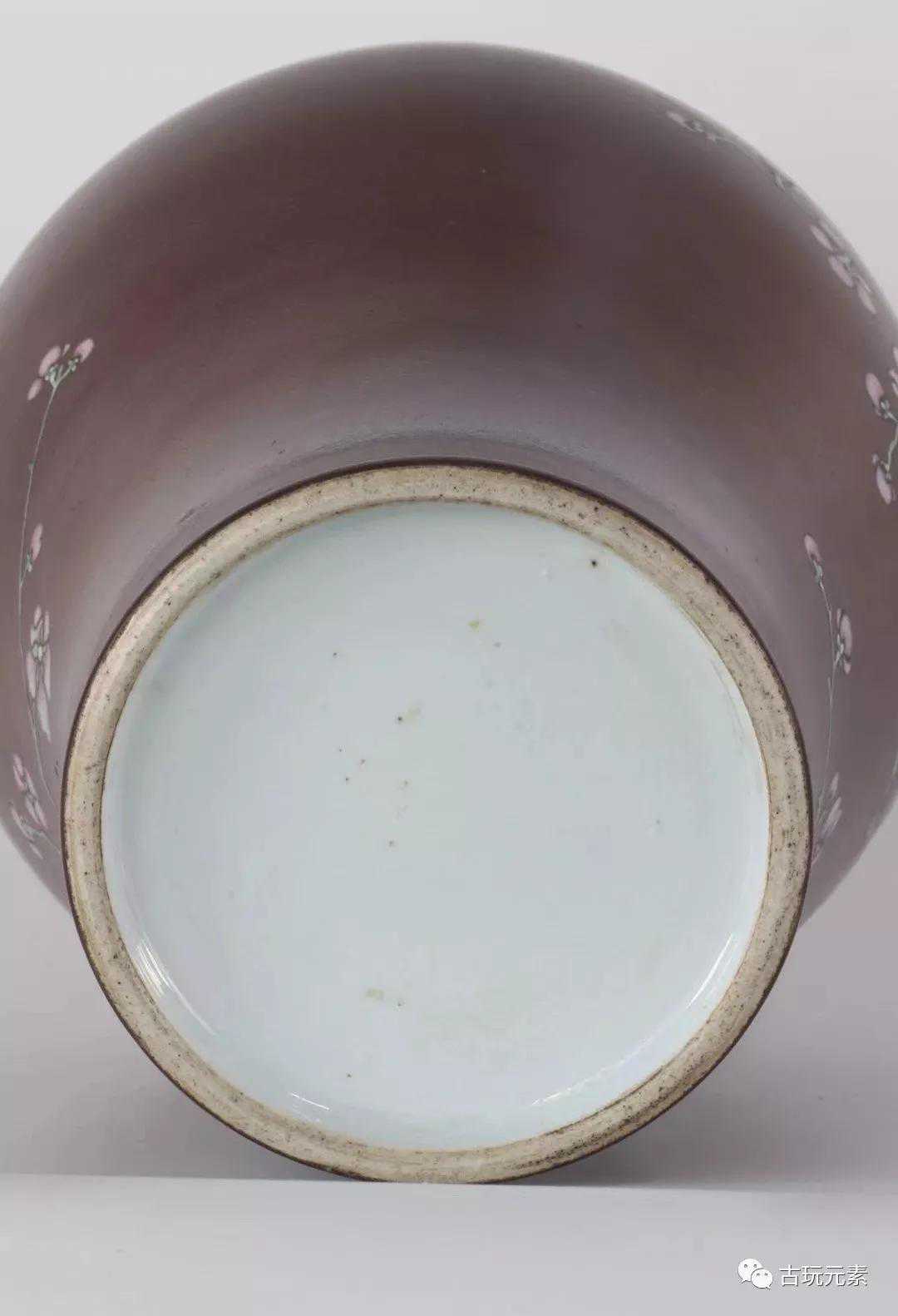 请注意梅瓶的底,没有款。在雍乾时期,朝廷对于官窑写款不写款,是有很严格的规定的,民窑的瓷器,你做的再精,也不能写款,否则的话就是逾制,就像现在的制度一样,你文章写的再好,落款也不能写国务院的名字。古代会杀头,现在也要拘留你,情节严重了,会被判刑的。我之所以这样说,只是认为,即使再有名的拍卖行,也不能忽悠参拍者。这件梅瓶就是一件民窑继红加彩的普通梅瓶罢了。