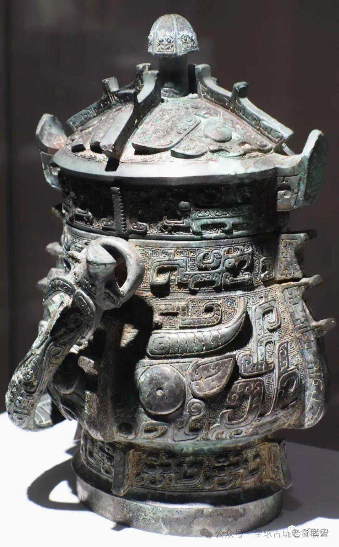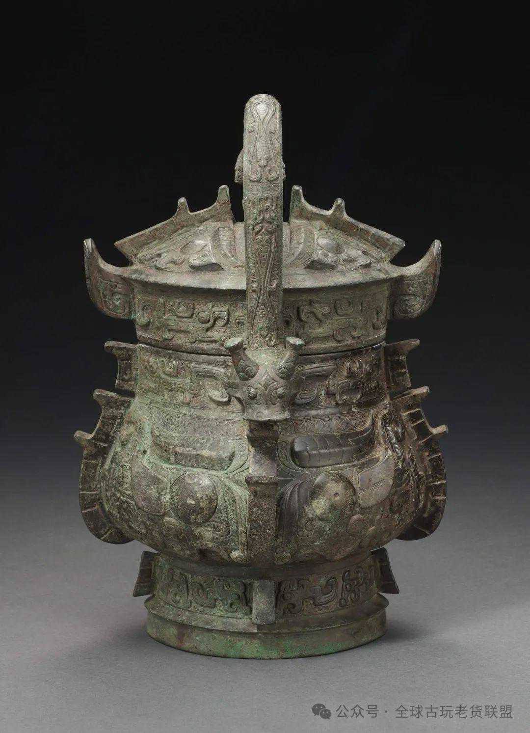 此件青铜卣平面椭圆,体型高挑硕大。盖部顶有圆形抓钮,盖面隆起,折沿直壁。盖与器子母口套合,器内有榫口,自颈以下逐渐宽阔,腹部垂鼓。颈部两端有半环,上套接“几”字形提梁。腹底承高圈足,上敛下侈,圈足下设增高的边条。卣装饰华丽,满工而作:盖钮呈瓜棱状,分六瓣,每瓣饰复育阶段的无翅蝉纹。盖面起四道扉棱,以长棱为鼻基、短棱为分隔线,浮雕两个牛纹。牛纹的角形似水牛角,角根横向,角尖上翘。盖壁短端出两条扉棱,长端各有一翘角,象鸟之尖喙,立面阴刻蝉纹。盖壁浮雕两组弯角鸟纹,以扉棱为界面面相对。弯角鸟纹是在鸟首后装饰一弯角,角根向下弯曲,角尖向上。