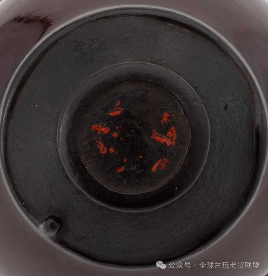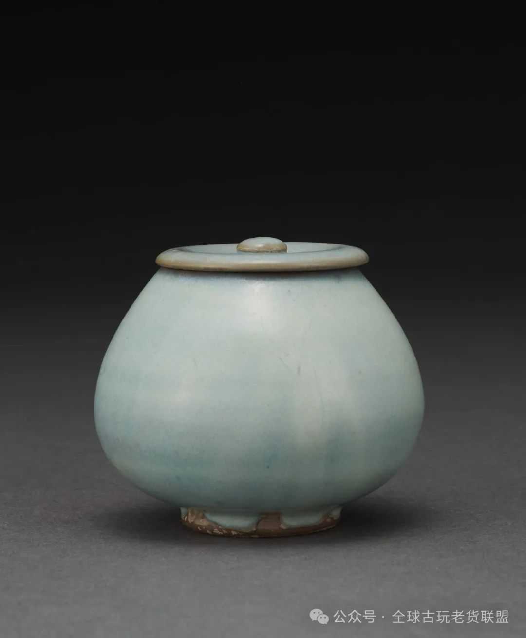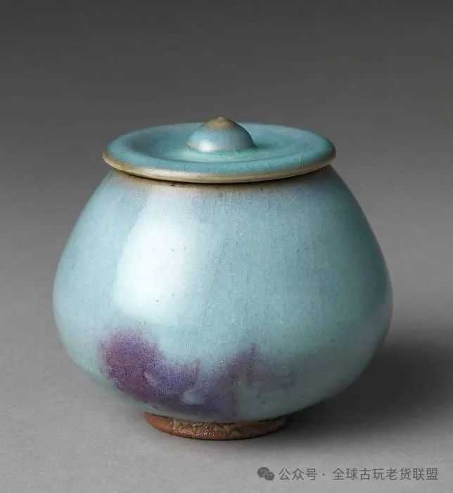 鸡心罐是钧窑名品,流行于宋、金、元时期,以敛口垂鼓腹形似鸡心而得名。同时代的其他窑口如汝窑等同样有鸡心罐,后世清代宫廷单色釉文房器亦有以此为本之作。美国纽约大都会博物馆藏钧窑紫斑带盖鸡心罐与本件器身基本相同,盖钮稍异。鸡心罐在流传过程中,盖部极易破损佚失,因此全品者尤为难得。