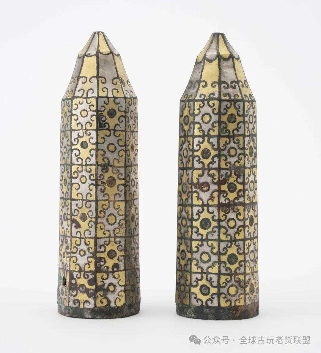 此对乃极为珍罕的軎殳,是軎和殳两种青铜构件的组合。器根部为车軎,一端细一端粗,中部凸起弦纹,粗端穿孔,用以纳辖,又称“轊”。弦纹和方孔四周错金,其余部分错银装饰。軎和辖是成对出现的车马器,軎套在车轴两端,加固轴头。形状多呈长筒形,一端粗一端细,粗端套接车轴。辖是车轴上的销子,长条形,上粗下细,顶端多有装饰,插入轴末端方孔,防止车轮脱出。