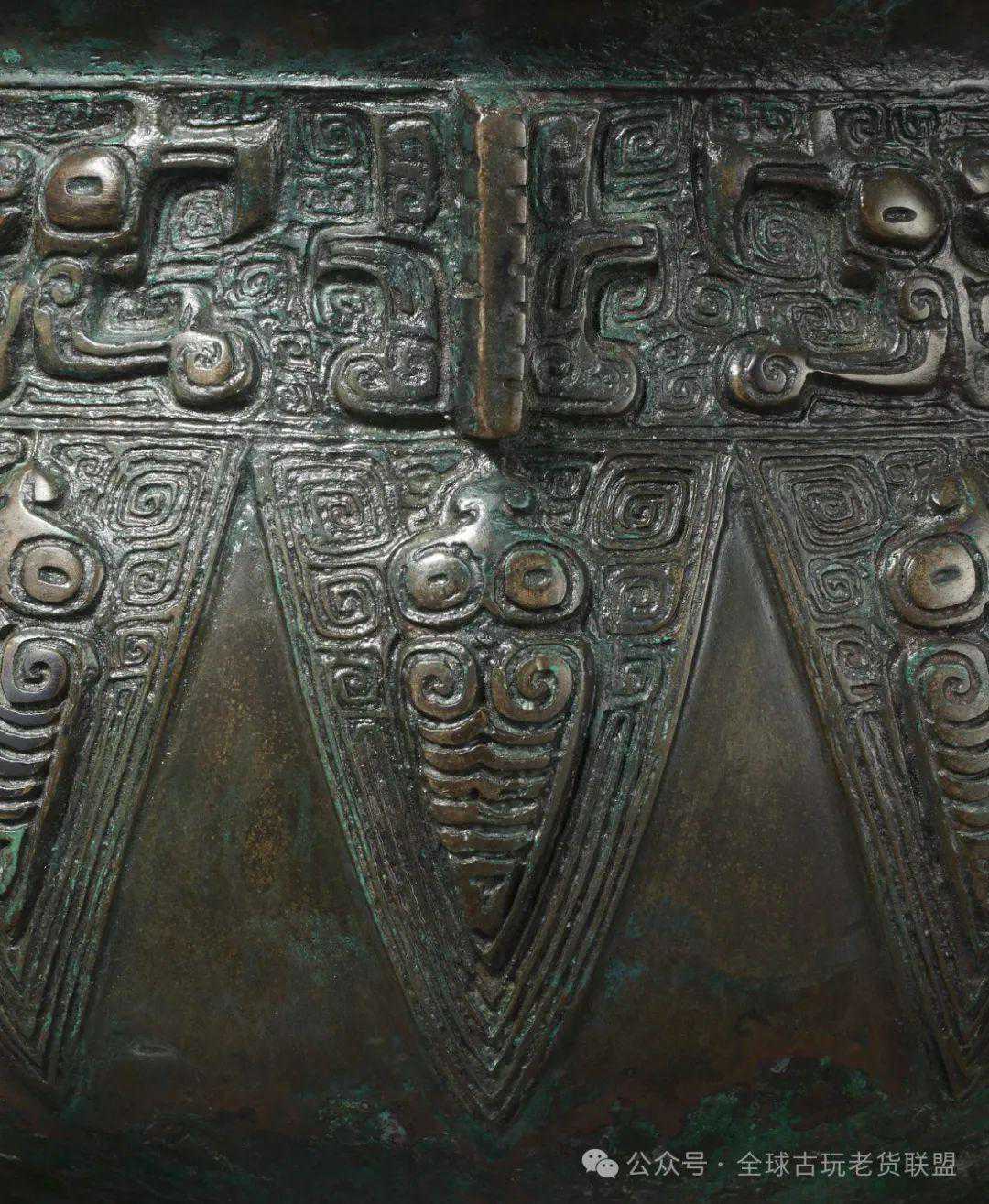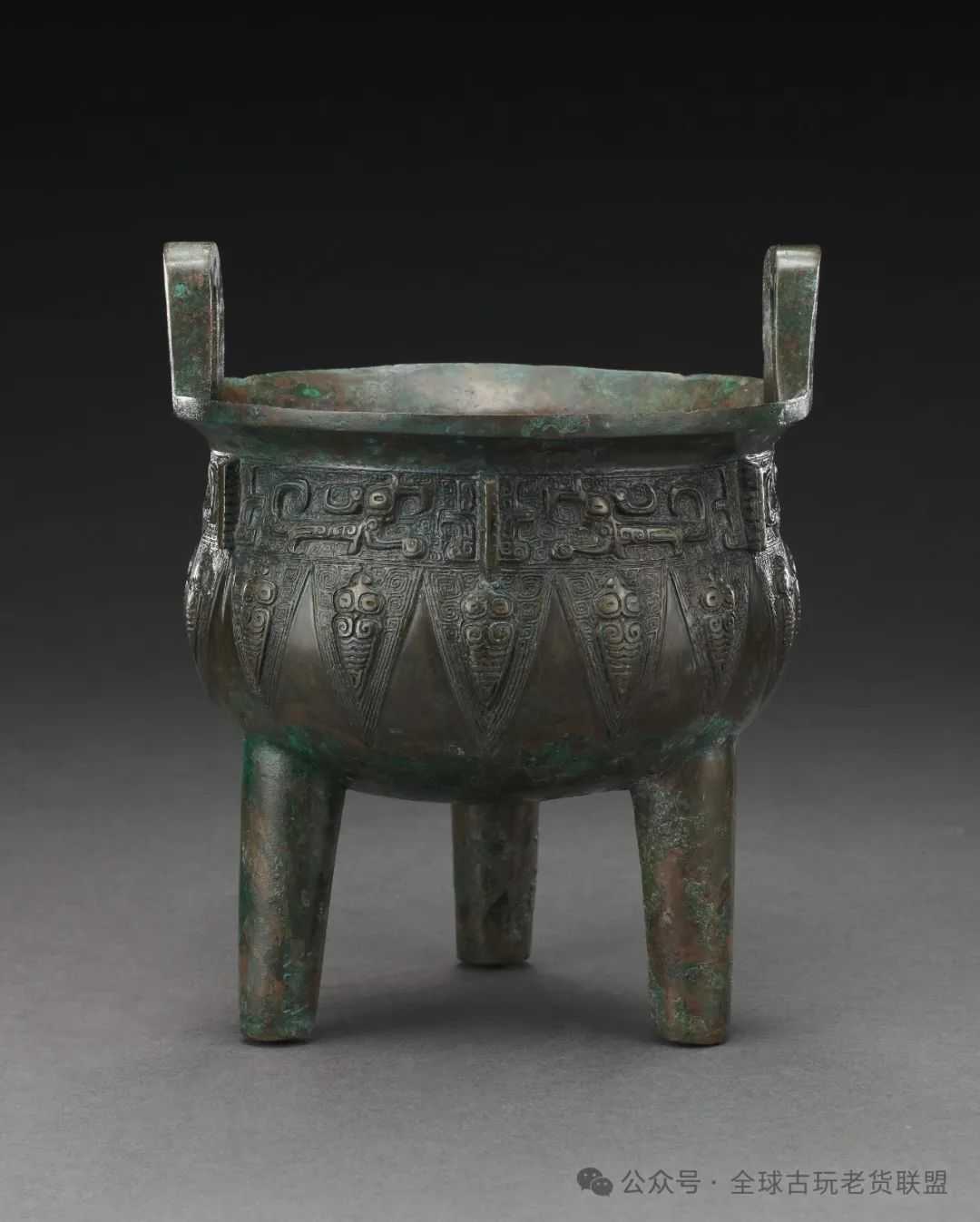 此件鼎侈口方唇,束颈鼓腹,沿上设一对立耳,圆底下承三条柱足。颈部环饰弯角兽体鸟纹,以扉棱间隔,腹饰垂叶蝉纹,均以云雷纹为地。弯角鸟纹的特征是在鸟的脑后有一弯角,角根粗壮,向下弯曲,尖部向上,流行于商末周初。蝉纹同样在此时流行,双目突出,不做翅翼,多用于辅助纹饰。在鼎腹部时,多竖构图,此件就是一例。鼎下垂的鼓腹,根部略粗的腿,都与安阳西北岗商末束颈立耳青铜鼎相似,是典型的商晚期器。