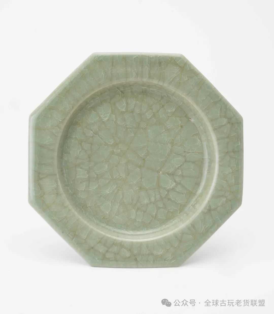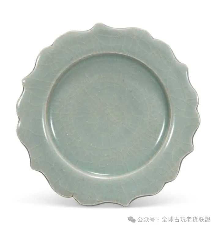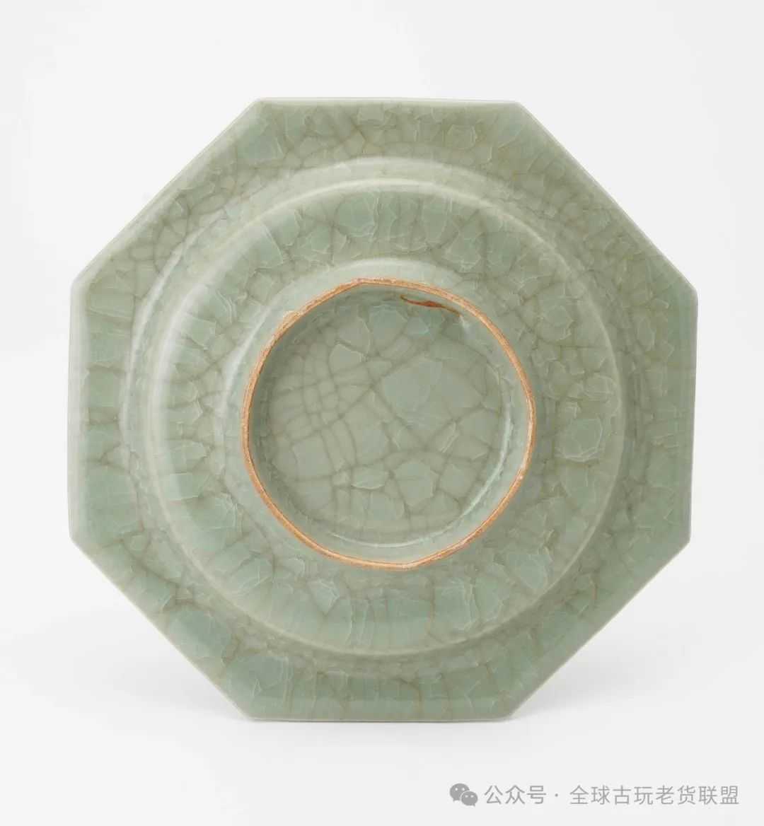 器形仿自金银器。此件敞口平折沿,弧形壁圈足。胎体致密坚实,胎土淡灰,底足露胎处见赭褐色窑红。釉色莹碧流动,呈粉青带黄绿之质,厚润如脂,温和内敛,微泛酥油光泽,乳浊感强,深得宋代官窑追求玉质感之精髓。釉面片纹大小各异,纹路清晰,纵横交错,最深为铁线,铁线之间穿插金丝。整器造型别致,是龙泉青瓷中的精品。