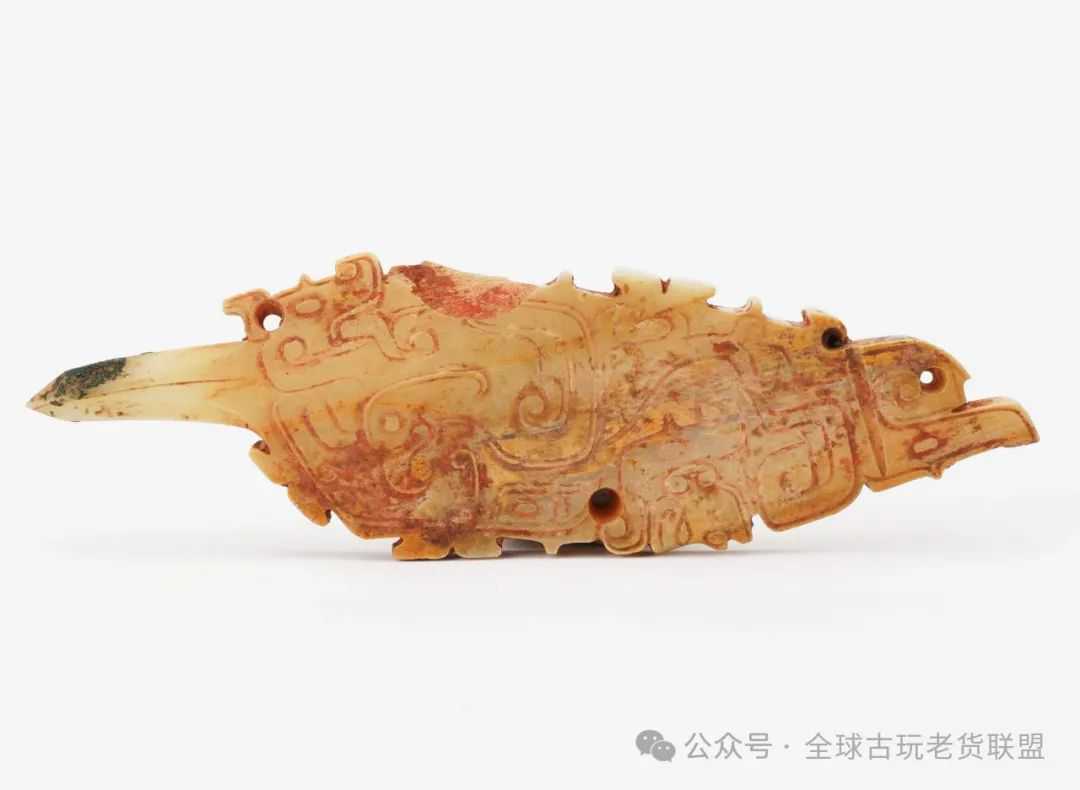 此件玉觽粗端硕大,其上打孔用以佩戴,尖锐部甚短,已完全变成装饰佩玉。粗端单面施刀,巧妙地融合龙纹、凤纹、神人图案于一身,采用一面坡、双阴线阳纹等技法,刻画轮廓线条,在平面上塑造出物象的立体感,是典型的西周玉作特征。整器纹饰繁复,同类中罕见,是难得的西周佩玉精品。