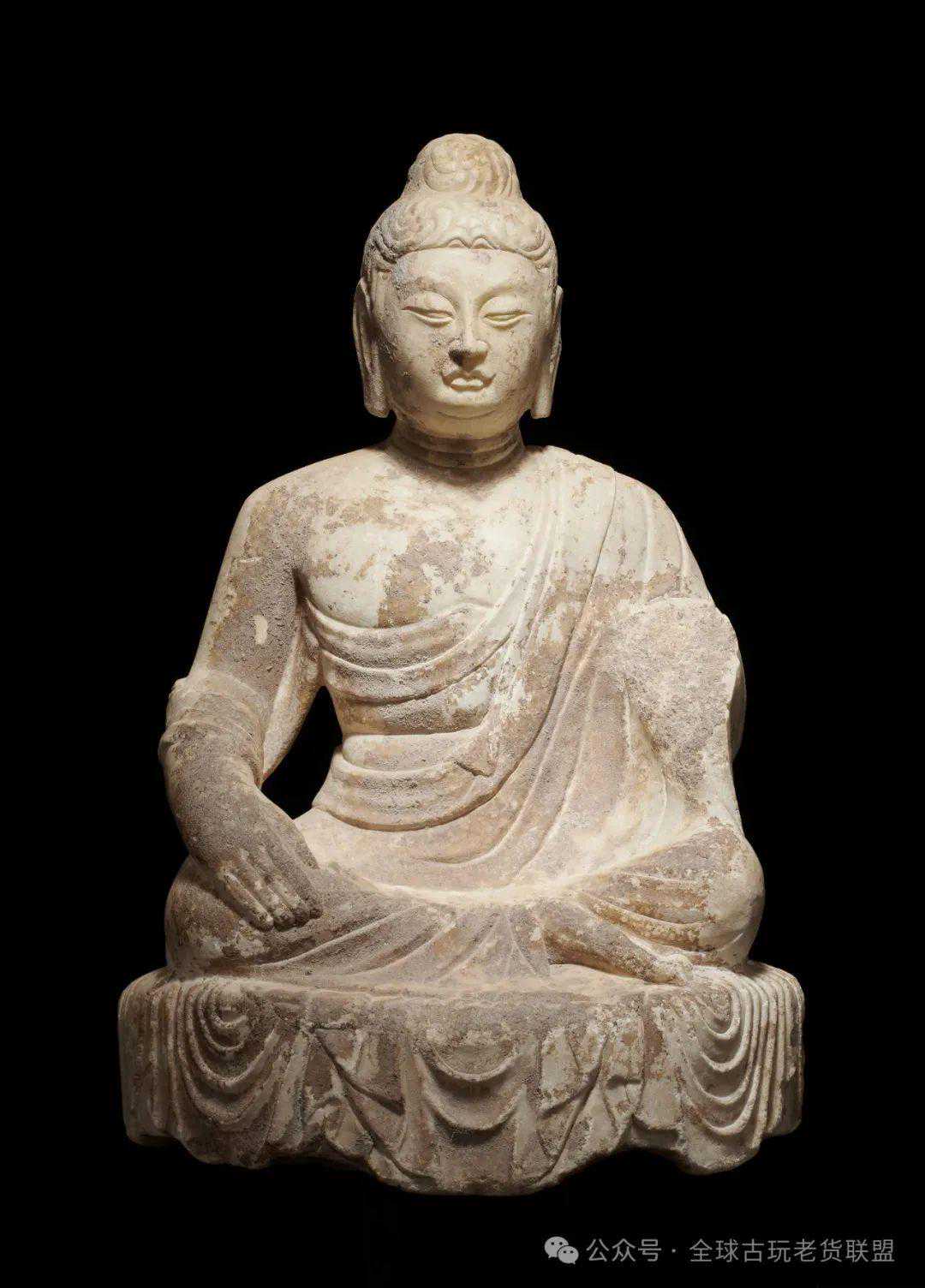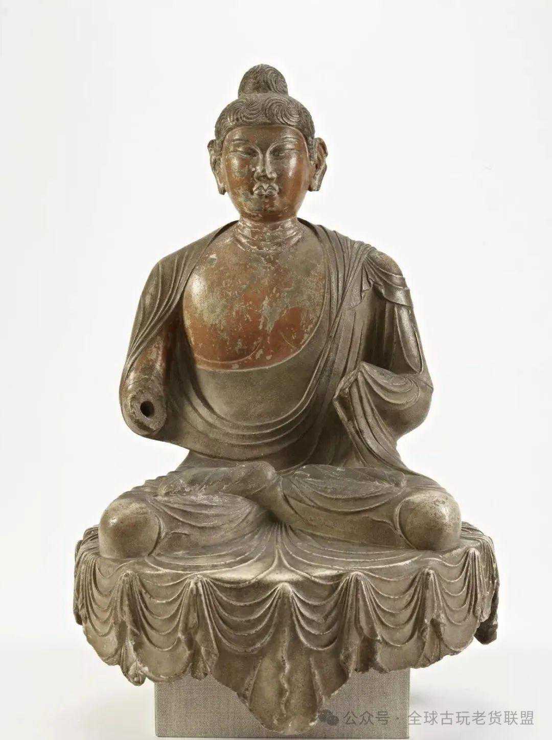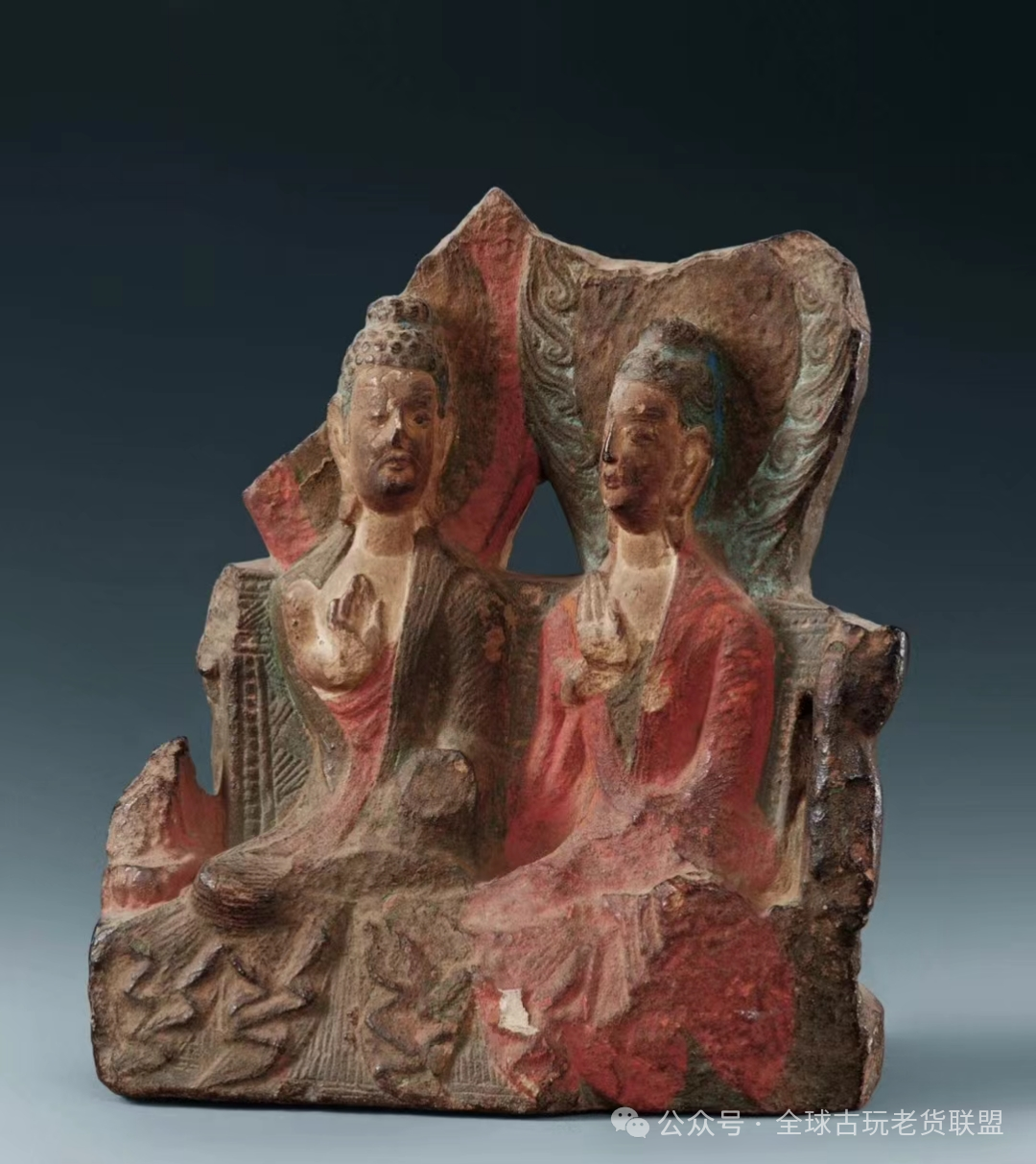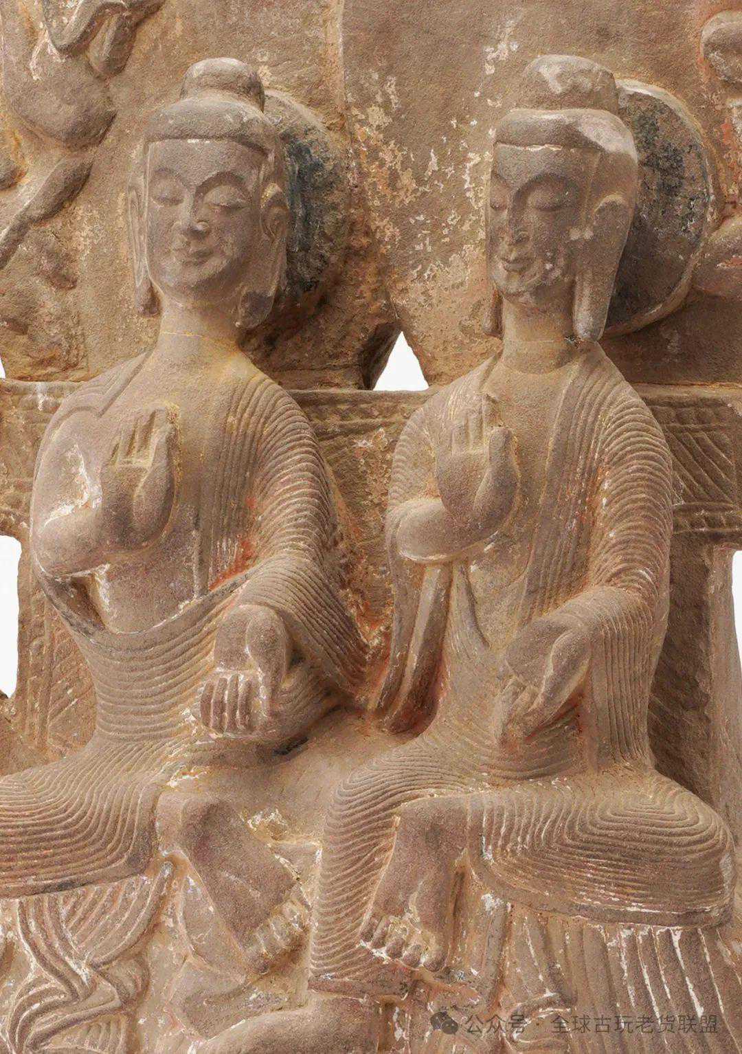 「二佛并坐」是中国佛教艺术特有的造像题材,在北魏至隋代盛极一时,以释迦、多宝二佛并坐为典型特征,源于《妙法莲华经卷四•见宝塔品》。经中记载,过去多宝佛行菩萨道时发大誓愿,若成佛、灭度之后,于十方国土有说《法华经》处,为闻是经,多宝塔必现,为作证明。当释迦佛欲说法华之际,多宝塔从地踊出,释尊分身云集,依众之请,开启塔户,多宝佛邀请释迦佛入塔,并分半座与释迦佛,「尔时,大众见二如来在七宝塔中师子座上结加跃坐」。两像头部背光,眉目清新秀气,大耳垂肩,佛右手掌心朝外,五指伸直向上施无畏印,左手施如愿印,结跏跌坐,披巾垂肩,腹前交叉穿璧,衣摆悬垂于须弥座前,独立并列,右侧佛身侧立一胁侍菩萨。整件造型古朴,刻画简饰,线条流畅自然,刀法犀利,透出智慧、慈悲、安详、高贵之气质,具有极高的艺术性。