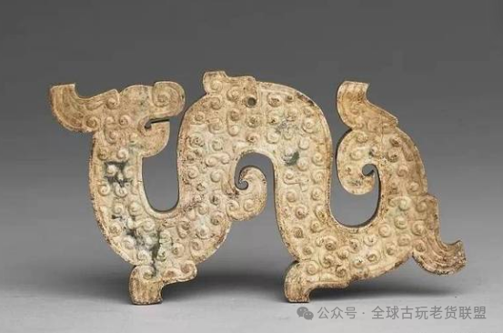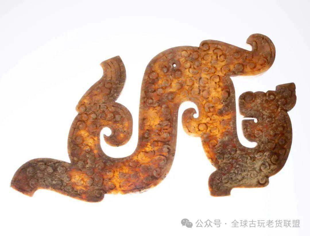 龙形佩是战国时代最具代表性的器形,造型上大致可分为独体玉龙和双首玉龙两种,其形状有璜形、玦形、螺旋形、S形、W形及翅翼形几种。本件龙形佩即独体的S形龙,身躯波曲,头部回首而望。其头部近方,颅顶角较短稍翘,通体以减地浮雕装饰谷纹,谷纹较突出,皆为战国早期流行特征。身躯一处打孔,系挂则两端平衡。
