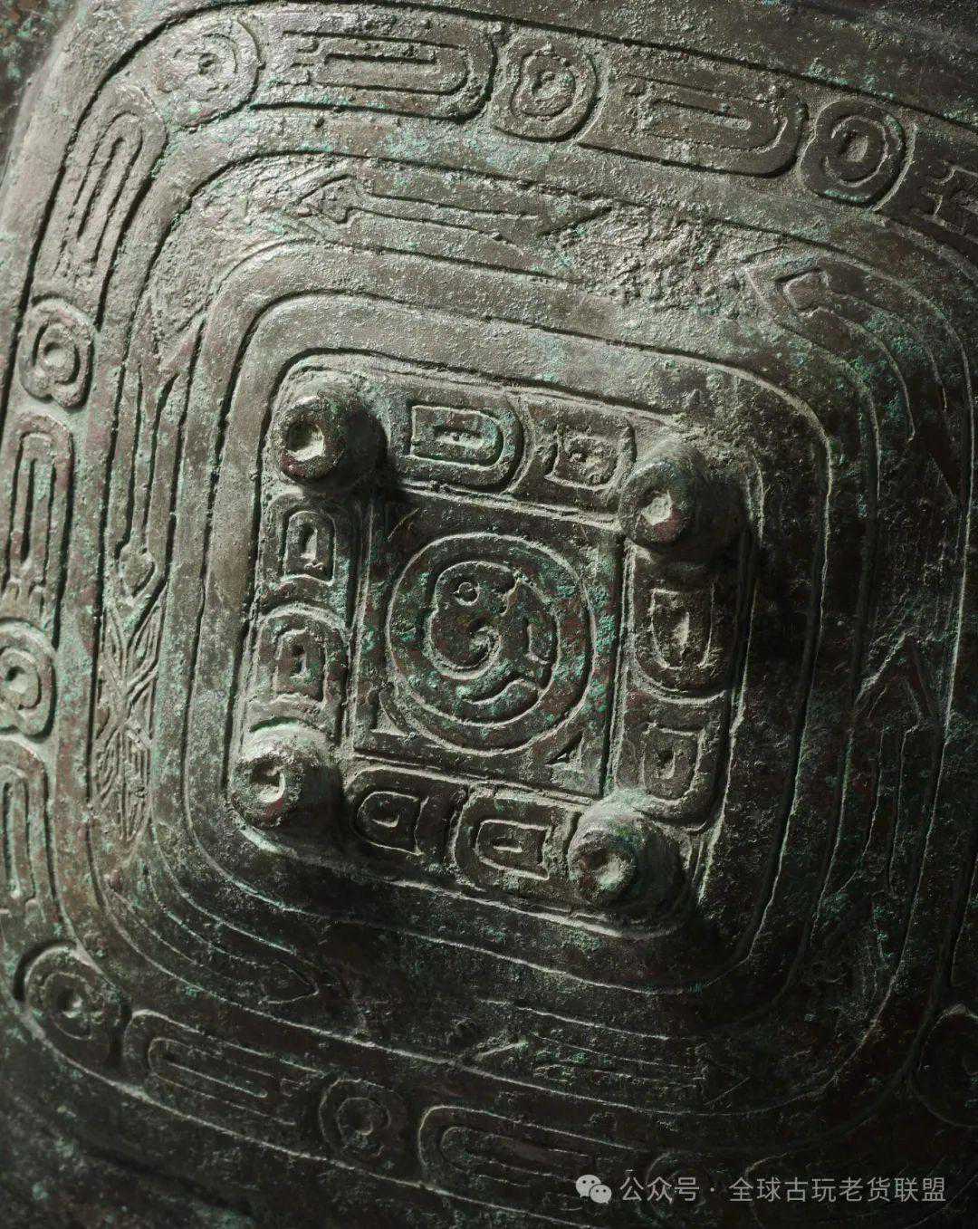 卣的器身四个方向自上而下出四条扉棱,每道分颈部、腹部、圈足三段,颈、腹段扉棱凸起鳍状翘角。颈部一周装饰弯角鸟纹,与器盖相呼应。腹部以两条扉棱为鼻基,两条为分界线,浮雕两个牛角型兽面纹。兽面与卣盖的牛纹一致,但两侧展开的身躯和下方兽爪,表明其并非牛纹,而是牛纹与兽纹结合的产物。圈足饰一周爬行龙纹,两只龙纹首尾相接成组,以扉棱为分界两两相对。提梁与器身短边连接,末端圆雕柱角龙首,梁上浮雕“S”形龙纹,两条龙并列一组,身躯之间填充两个蝉纹。整器采用商末周初经典的“三层花”技法装饰,兽、龙、鸟的目圆鼓,身躯浮雕,阴线刻绘细节,辅以云雷纹地。其中腹部兽面的双目硕大,两耳尖端微微翘起,立体感强烈,轮廓深峻,庄严凝重。