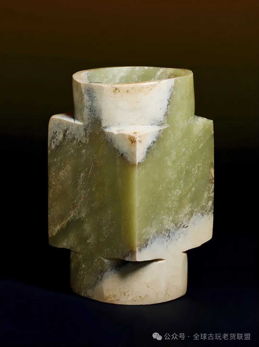 此件拍品青玉质,温润纯厚,部分钙化,局部有黄、褐色沁。琮内圆外方,两端有射,射管外壁略方,中孔圆形,孔内饰台阶痕。整器打磨抛光讲究。此玉琮工艺,体量修长,宁静沉稳,散发历史厚重感,展示出先民与神灵深度沟通之境界,应为当时至高等级的祭祀礼仪用器。