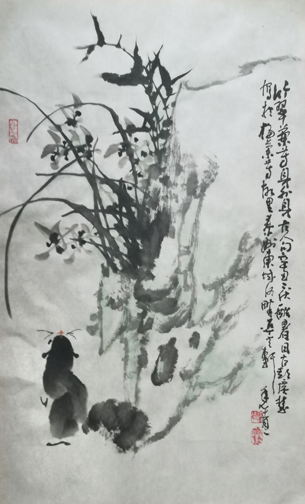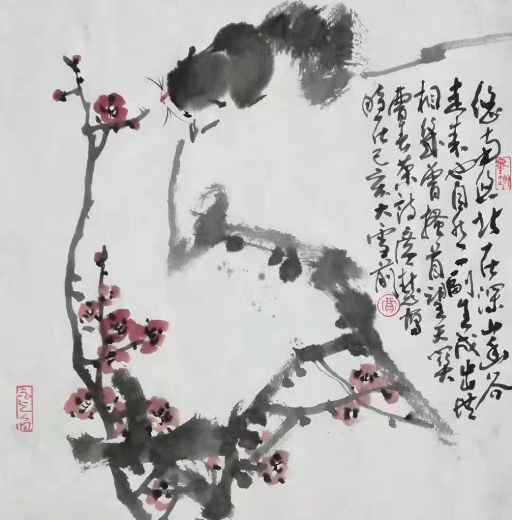 意境是作品的灵魂,也是画家灵魂的体现。在立意造境方面,他回避被人画滥的题意,开拓新的意趣,多以松梅兰竹、山石、冰雪、农家瓜果、田园风光为素材组合,配以诗言精句,深化主题。如《踏雪寻梅》《幽谷赏兰》《登高望远》《鼠目不寸光》《清食风霜雪》《临崖坐禅》《阅尽人间》《苦乐年华》等作品,其意韵清新悠长,给人以丰富的审美趣味。