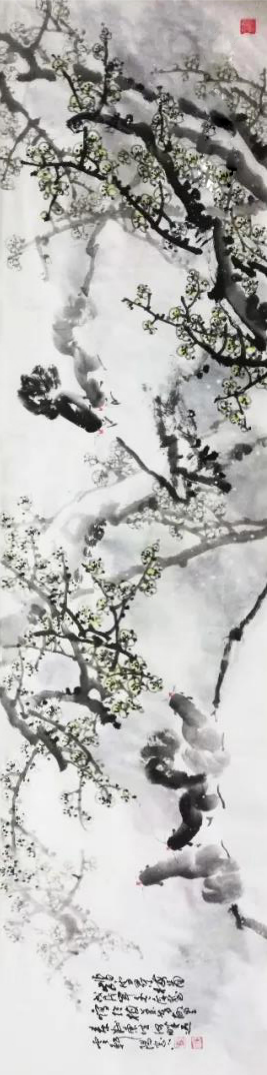 关于广慧的梅花,我是比较推崇的,“傲骨梅无仰面花”,广慧画梅充斥一种豪迈之情,人与梅花融为一体,迎风傲雪,多铁骨铮铮之姿,疏放冷艳之中,有一种寂寞中的自足,玉蕊生香不染尘,远非俗家迎春手笔可比拟。这类佳作沙黑曾撰《梅花人间情》以力荐,文图互印相得益彰,眼前有景道不得,我也只能自叹笔拙,谈画止于斯了。