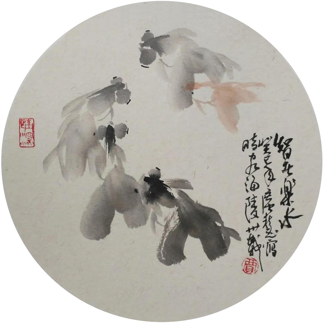 写意造型崇尚简练夸张,高度概括。他经过20余年的摸索锤炼,以“大体一笔”墨完成理想的松鼠形态。其笔的动作是一次性饱蘸水墨的兼毫斗笔,从头逆锋落笔,按、揉、提、顿、挫,回锋收笔,一气呵成,一波三折中呈现出轻重、快慢、方圆、虚实、苍润、浓淡、洇晕,笔气笔势,骨肉精神及绒毛的感觉,之后,换笔以意象凝练的点线画出鼻眼须爪腿,倾刻间一只可爱的小松鼠便诞生了。同样的“大体一笔”亦可塑造立、蹲、跑、跳、爬,正反、俯仰、伸缩等不同形态,其形象设计巧妙地采用、借鉴俯视角度和儿童化面、头部特征,充分显现出小生命的稚拙灵动性。