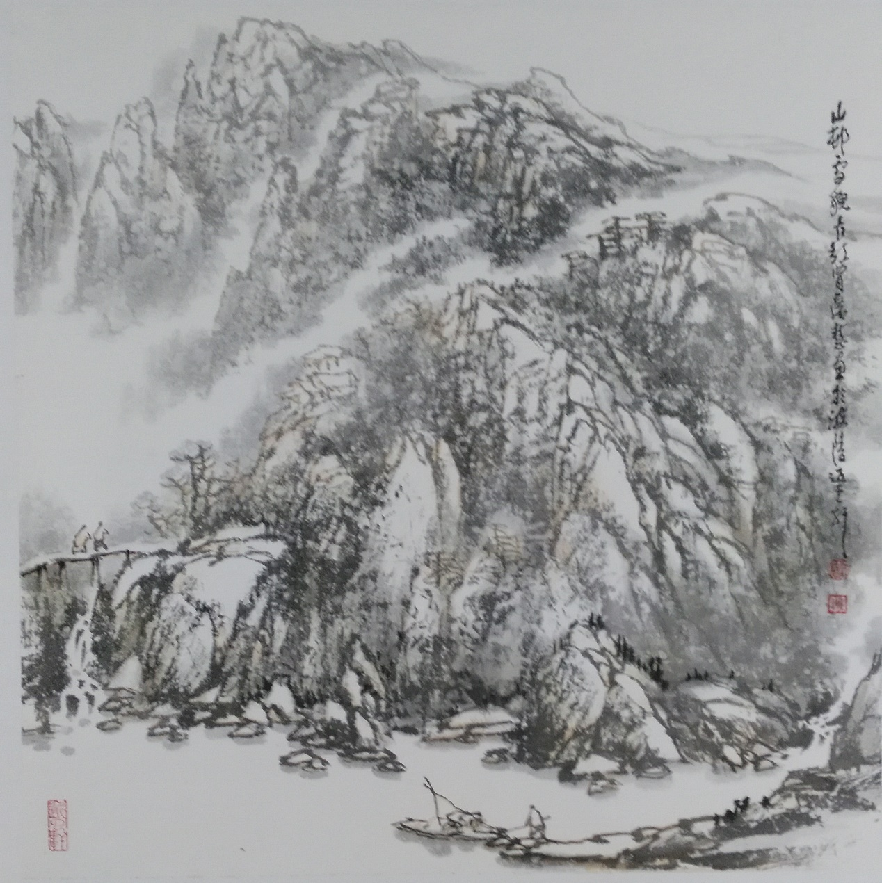山水有清音,广慧诸画中,我最喜其山水。当代画家习作山水多半上承宋元,近学石涛,从“四王”至近代诸贤中取法,广慧的笔墨功底大抵也是由斯而来,他是徐州人,笔下山水自然可以归入李可染一派,却又不囿成规,熟谙积染之法的同时,多受海上陆俨少的影响,用笔纵意而多变,构图大开大阖,尽显大山、大水、大意境的特点。