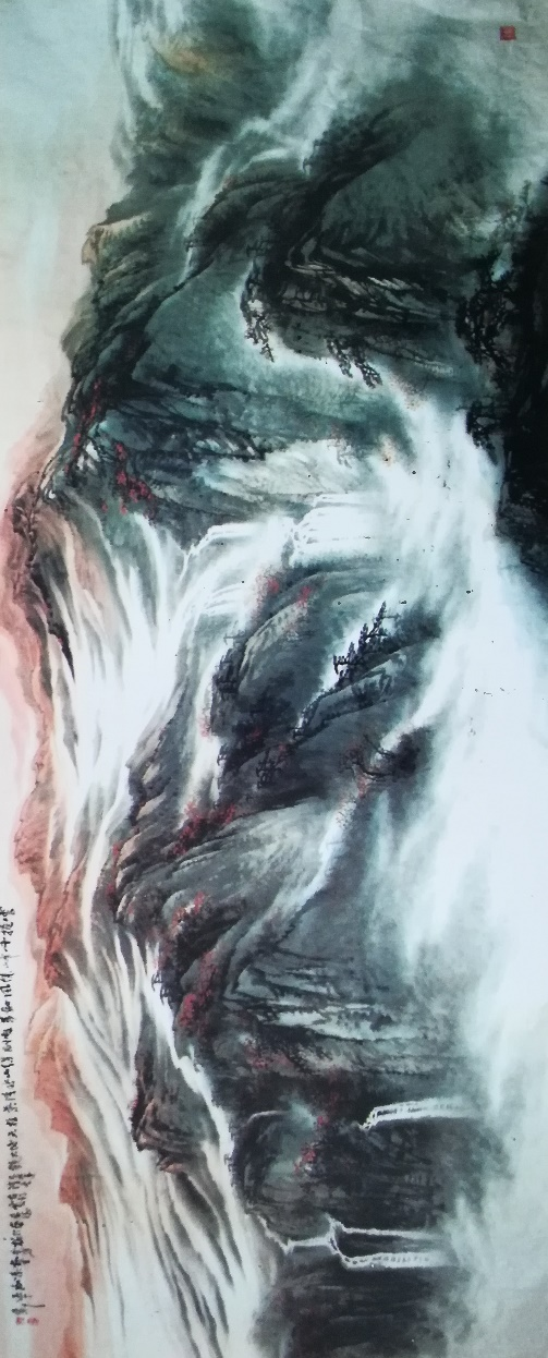 广慧的山水多为大幅,他应泰州净因寺请为之客堂所作山水堪称巨幅,宽竖六尺余,长足两丈四,逶迤群山,峰巅连绵,自然山水与宇宙天地融为一体,笔力找鼎,气势撼人,台湾了中法师看了亦叹为观止,直赞佳构天成,有磅薄大气存焉。记得画初成时,广慧约我近云轩看稿,画室很小,这边打开那边收起,山水叠折中,无限风光尽被占,瞬间的震撼感让我记忆犹新。