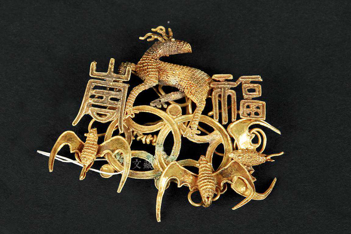 吉祥语簪钗是清代多见的首饰类型,几种事物组合在一起取其谐音组成吉祥语,乃清代首饰常见的设计创意,所谓「有图必有意,有意必吉祥」。蝙蝠、寿桃、蝴蝶、瓜瓞、花瓶、獾、鹿等等具象事物皆可表达祝颂祈福的美意,清代文化中善于唱诵祝福的风气亦体现于金银首饰里。