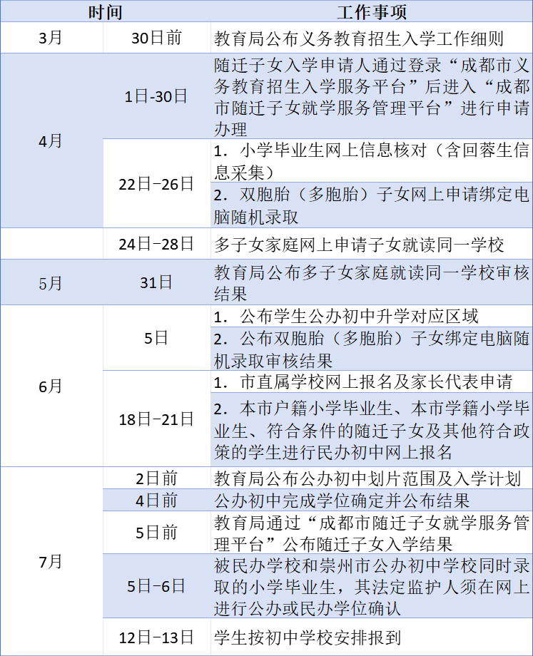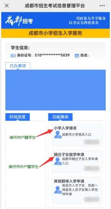 2、随迁子女入学。崇州市外户籍随迁子女法定监护人于4月1日—4月30日登录“成都市随迁子女就学服务管理平台”进行申请办理。
