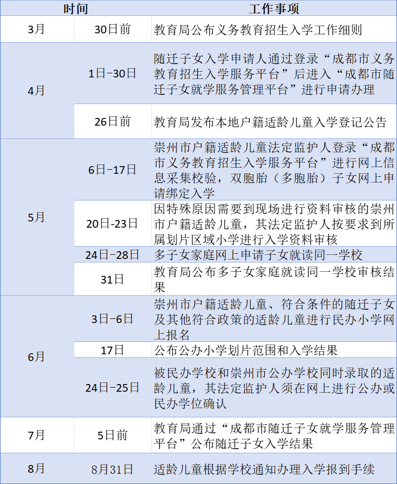 1、户籍地学生入学。崇州市户籍适龄儿童法定监护人于5月6日—17日登录“成都市义务教育招生入学服务平台”进行网上信息采集;5月20日—23日,户籍信息未通过公安户籍系统校验的,法定监护人持户口簿到户籍划片对应学校进行入学资料审核。
