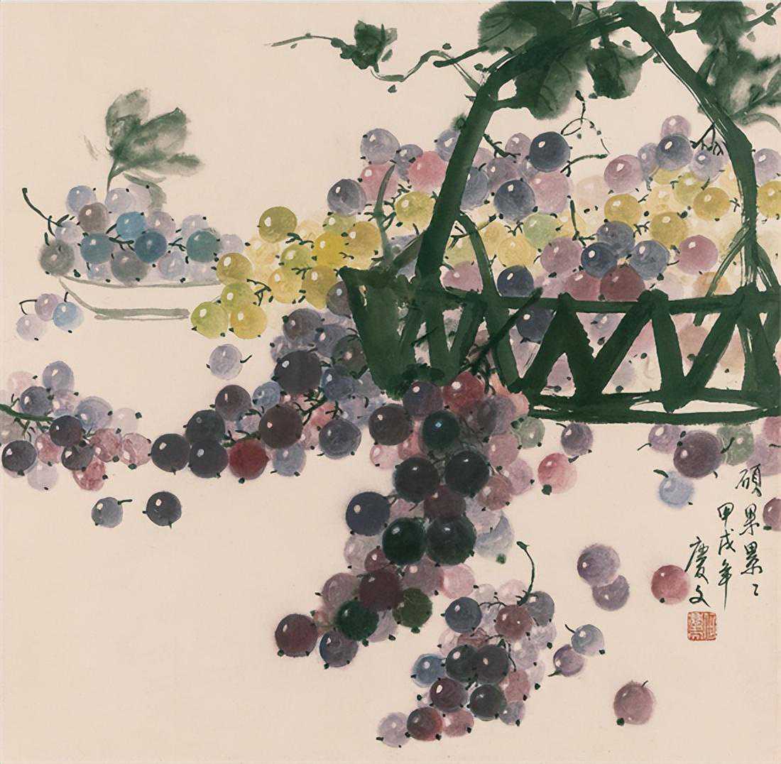 “葡萄”为“何氏三绝”画作之一,其技法在采用中国传统绘画技艺的基础上,融入西洋画高光、色彩等静物写生之元素。果实累累、色彩丰富,珠肌玉质、晶莹剔透,是本画种的风格特点。