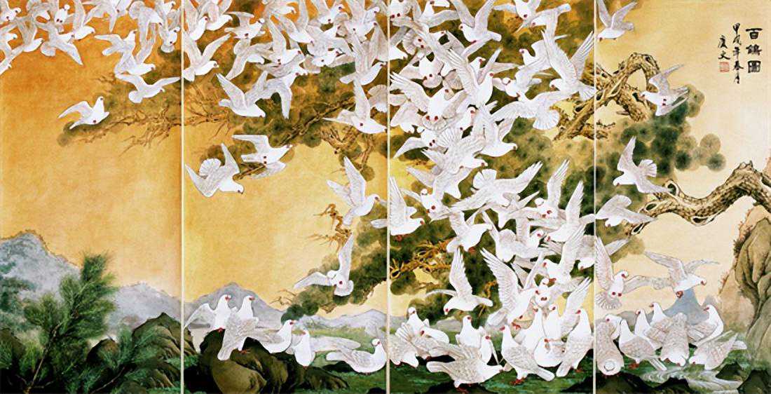 百鸽图136X63cmx4(1994年)作者:何庆文
