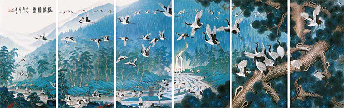 松龄鹤寿(百鹤图)136x69cmx6(1998年)作者:何庆文
