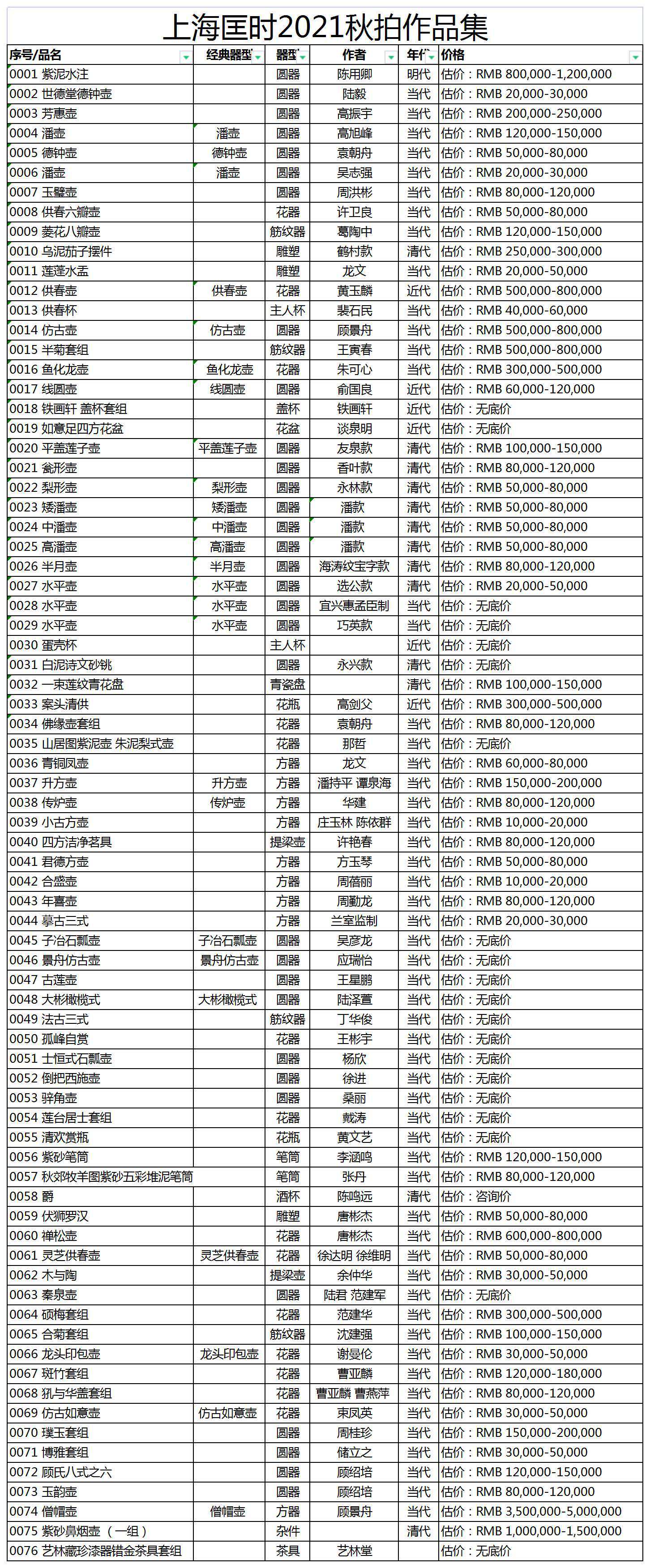 时间回到上海匡时2021秋拍于12月29日晚间在上海大剧院八楼,共六个专场,一千两百余件艺术佳作,紫砂拍卖专场让人记忆深刻的拍品,明、陈用卿、紫泥水注成交价:万;清、陈鸣远、爵、成交价:RMB1909万;还有清、紫砂鼻烟壶一组成交价:万。
