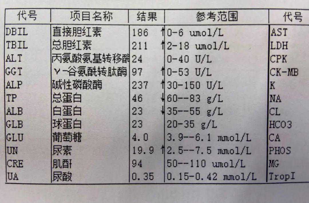 肝功能:除丙氨酸氨基转移酶外,直接胆红素、总胆红素、γ-谷氨酰转肽酶、碱性磷酸酶均有所升高,说明肝细胞功能有所损伤,卡培他滨主要经肝脏代谢,因此,该患者暂缓化疗,同时予以保肝药物治疗。
