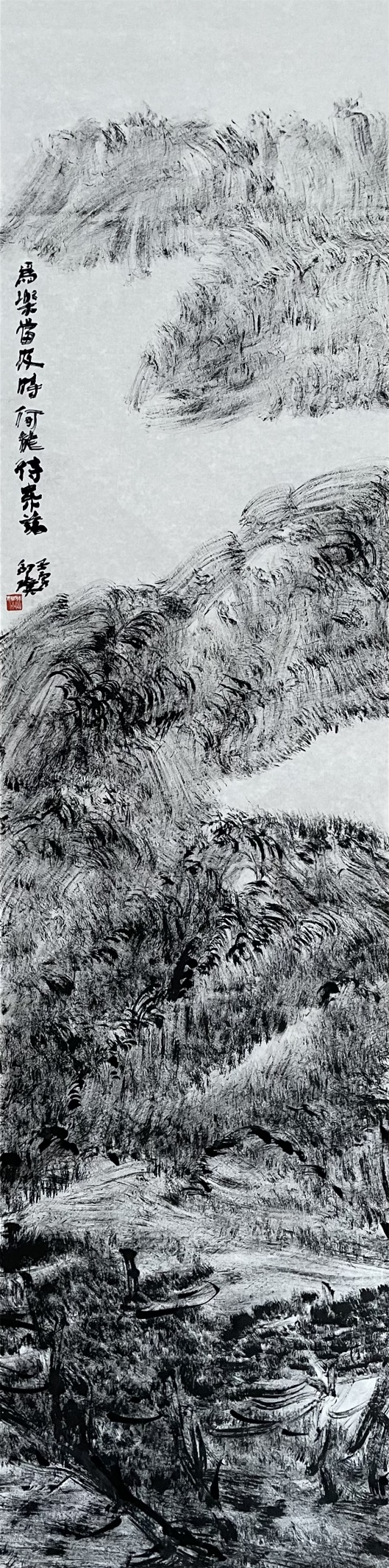 不过在邵璞近期的焦墨画中,那片迷人的灰的指向性有所增加,其笔下的山川草木,更加暗流涌动,使赏画者观之,心潮跌宕起伏;在形体构造上,邵璞的焦墨画也更多人格化处理:那是一座山,可也是一个人,或一个动物,人或动物的一部分、一个动作、一个表情。为赏画者所熟悉的人格化语言,极易打动赏画者的心。只是这指向性的至高点在何处?相信邵璞有一天能够找到,创作出画坛期盼已久的旷世杰作。