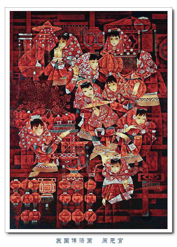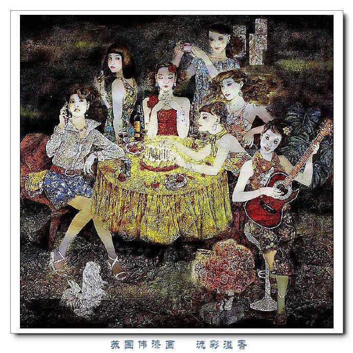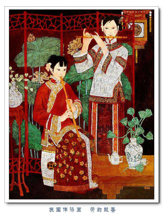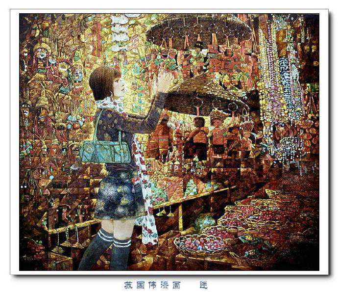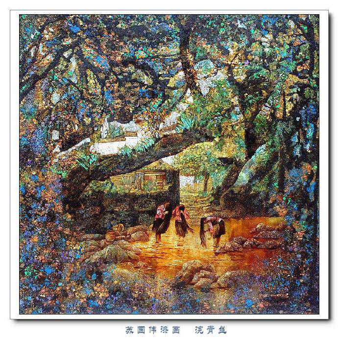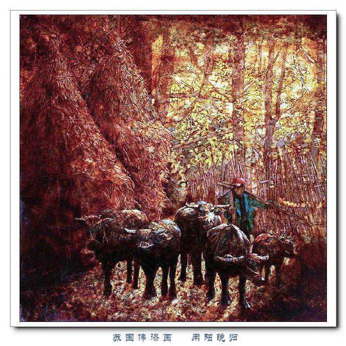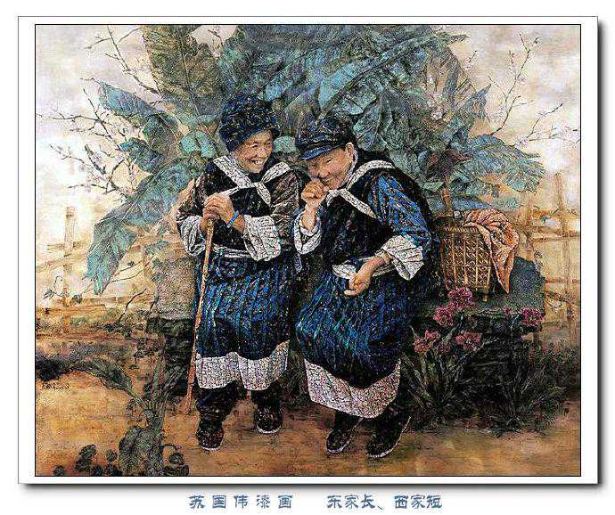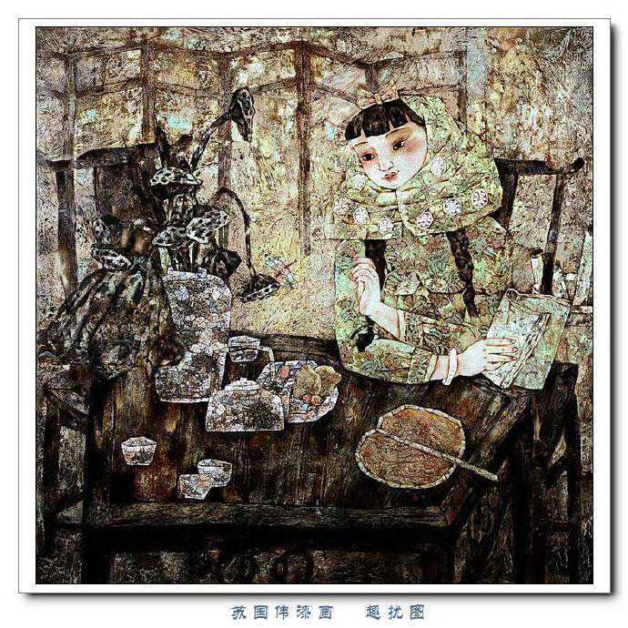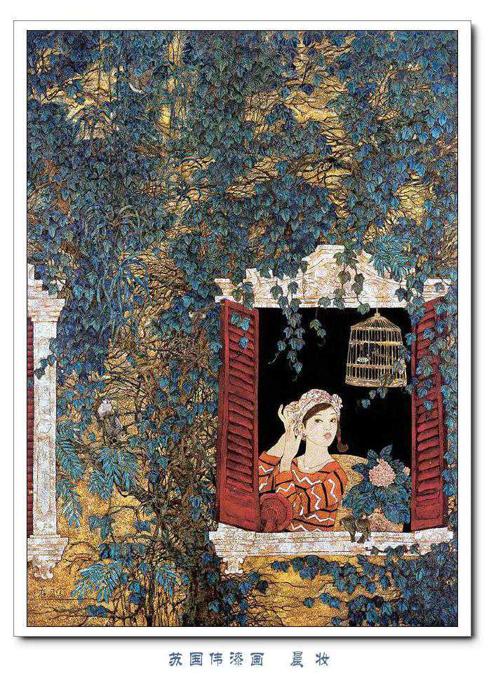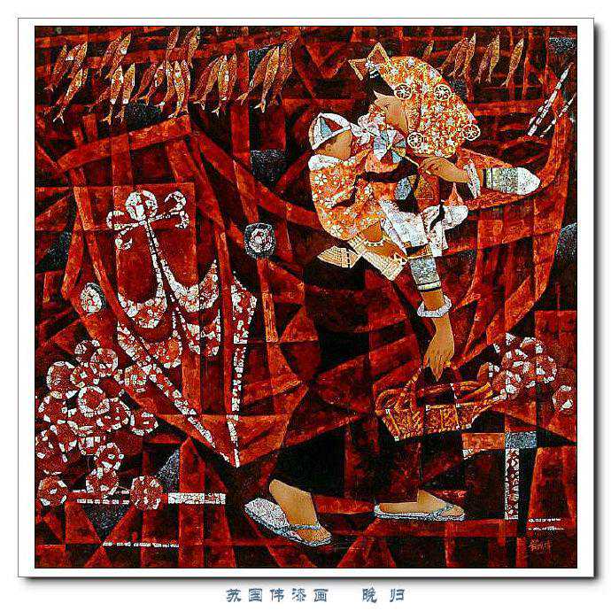 苏国伟从国画、油画、版画等中西方绘画领域中吸收养分,用漆画技法进行自己的诠释和演绎,让漆画更具艺术性。苏国伟擅长人物题材漆画,此类作品画面构图自由活泼,对作品人物的刻划细腻独到,对色彩应用以暖色为主,表现出浓郁的生活气息和较强的感染力。苏国伟花鸟漆画作品形式奔放,构图形散神聚,细致入微,栩栩如生。苏国伟的风景漆画作品多以客家或闽南地域风土为主,画面营造出宁静、深幽的意境,并将中国传统漆艺术沉稳厚重的质感融入作品,传达出画家对家乡的深深眷恋。在近年的作品中,苏国伟在画面形式、肌理、漆艺、材料等方面都进行了不断改革,拓展漆画艺术语言的表现力,努力追求“艳而不厌、繁而不烦”的美学效果。