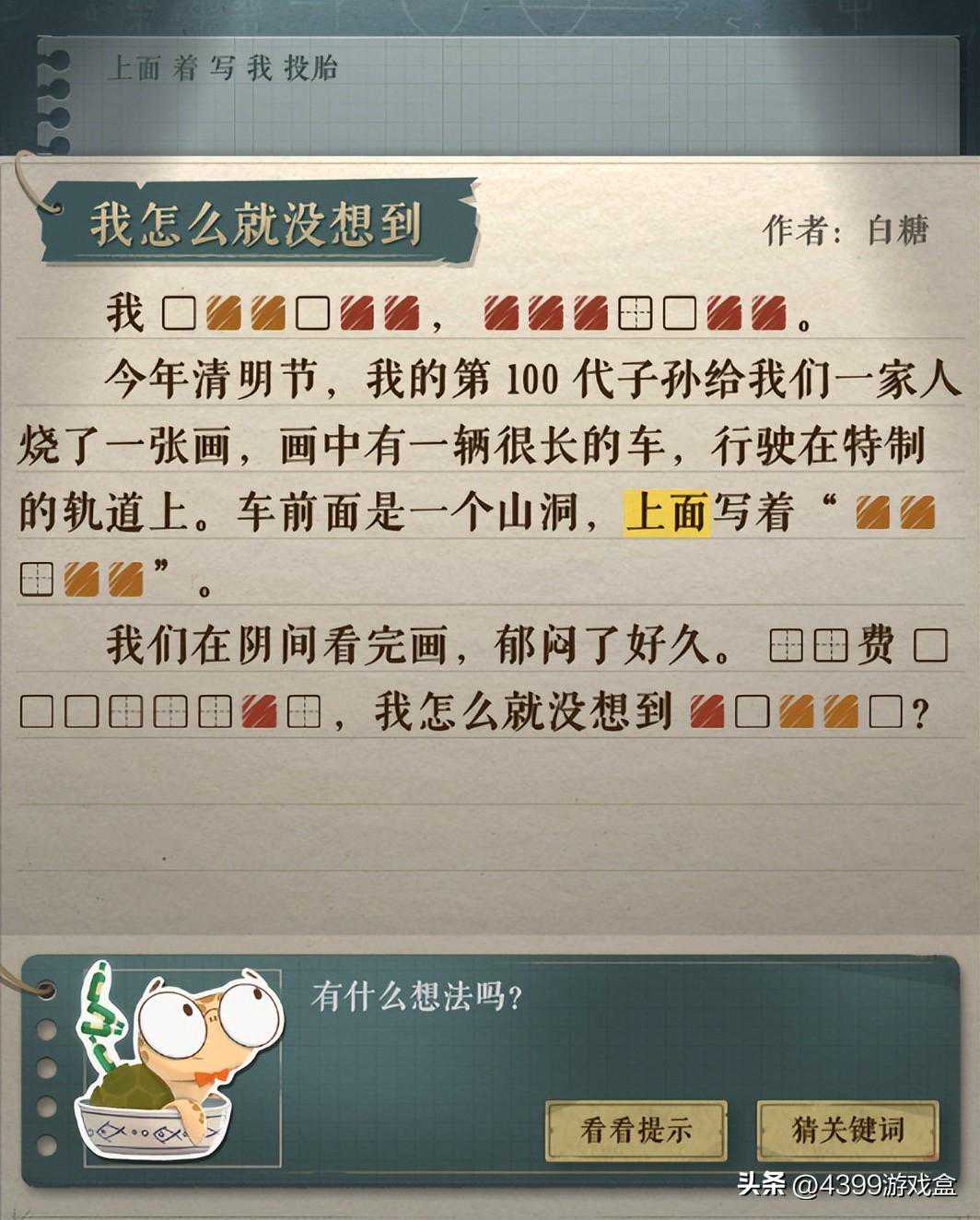 游戏中玩家可以根据故事的大致框架,一直不断猜测关键词,当关键词或是近义词触发时便可以得到相应的奖励、以及填补空位还原故事。