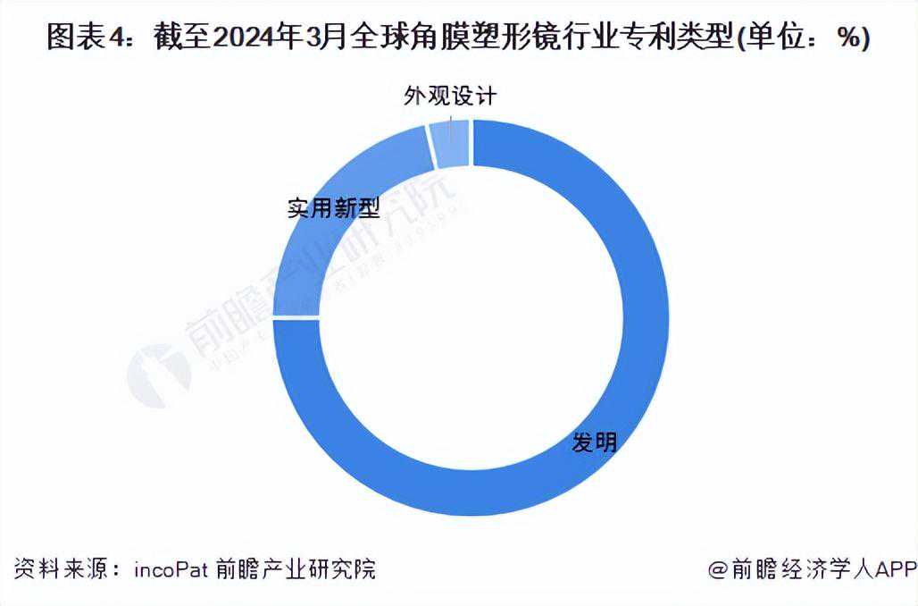全球角膜塑形镜行业专利类型以发明专利为主,截至2024年3月,全球角膜塑形镜行业发明专利占比约达75%,实用新型专利占比约达21%。