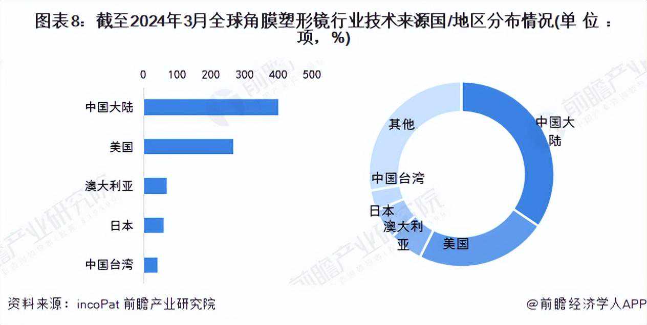 从专利申请量来看,2010-2023年,全球角膜塑形镜专利申请数量整体呈上升趋势,2023年角膜塑形镜专利申请数量为57项;从专利授权量来看,2010-2023年,全球角膜塑形镜专利授权量整体呈上升趋势,2023年全球角膜塑形镜专利授权量为28项。