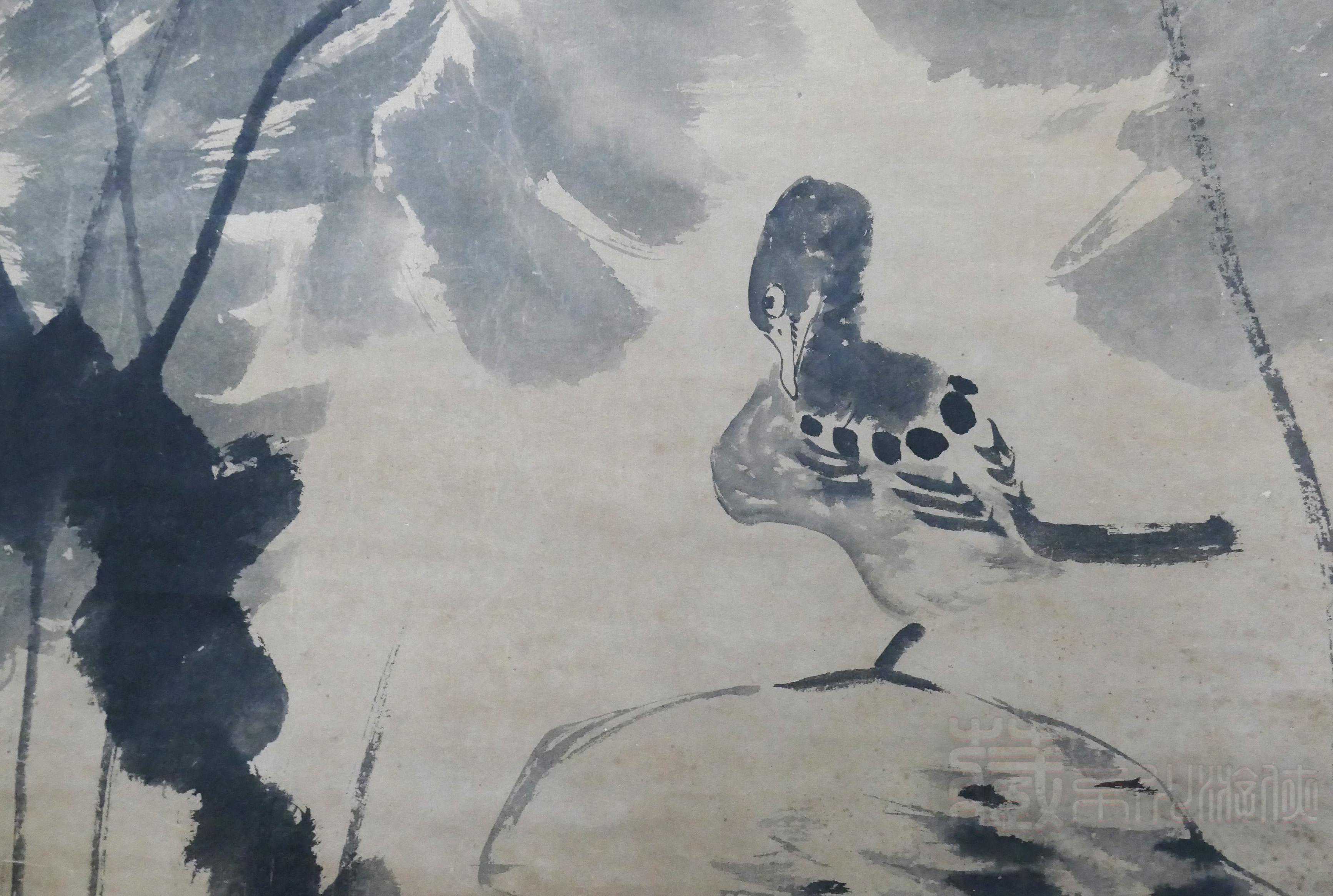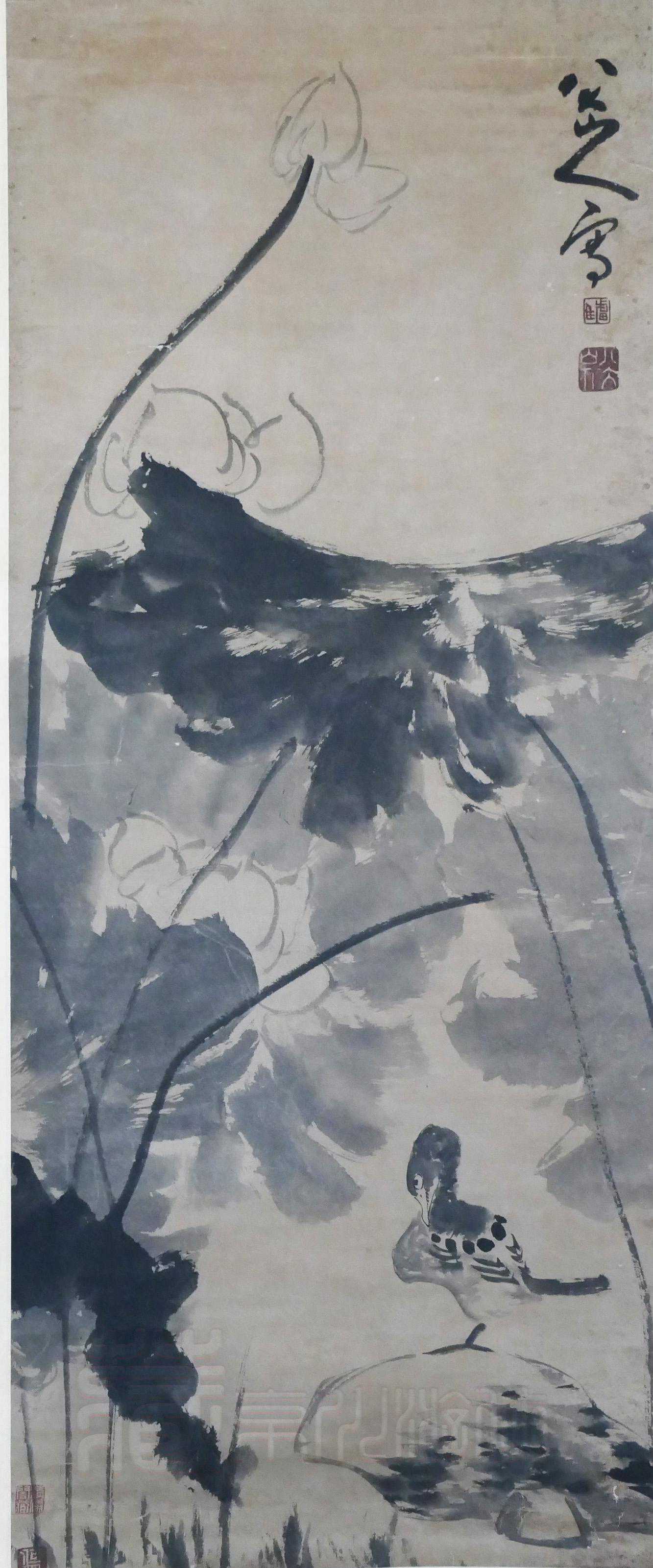 鉴赏此画。纸本水墨,画心规格约为122*50厘米,属于八大山人于康熙二十二年(公元1683年)至康熙二十六年(公元1687年)还俗初期出现的大幅花鸟水墨画。续可见画幅中以荷叶荷花、石头与鸟禽构成。其构图简练,大写意之笔法娴熟而狂放,浓淡相间,运笔自然,荷叶展放,荷花傲立,石纹形态尽显。而其构图核心,一只鸟禽鸟站立于石之上,低头清理羽毛之状,翻白眼,单腿站立,笔法简练,泼墨点染,生动神态呼之欲出。此等无论构图还是运笔风格,均凸显了八大山人画鸟与植物之典型手法。鉴赏整个画面,写其大意,传其精神,一气呵成,率性磅礴之气势彰显,简练之中意蕴深厚,艺术感染力确为非凡,宗师风范,一览无遗矣。