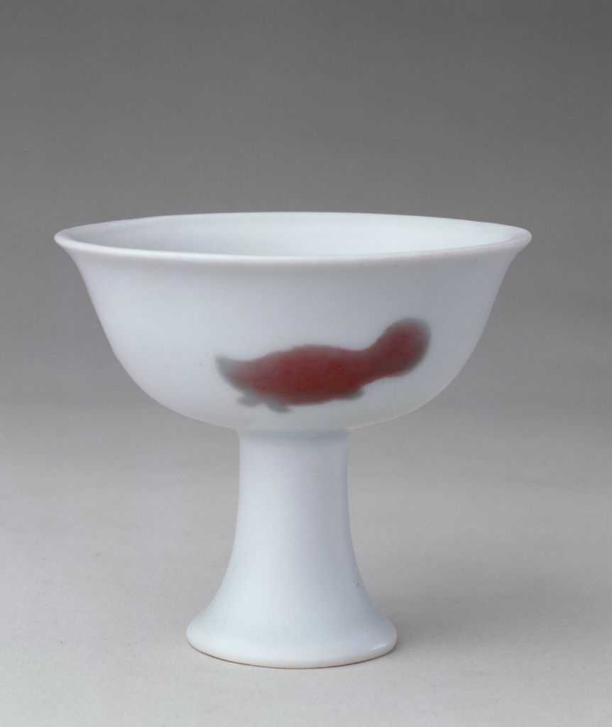 釉里红三鱼纹高足碗,明宣德,高8.8厘米,口径9.9厘米,足径4.4厘米。