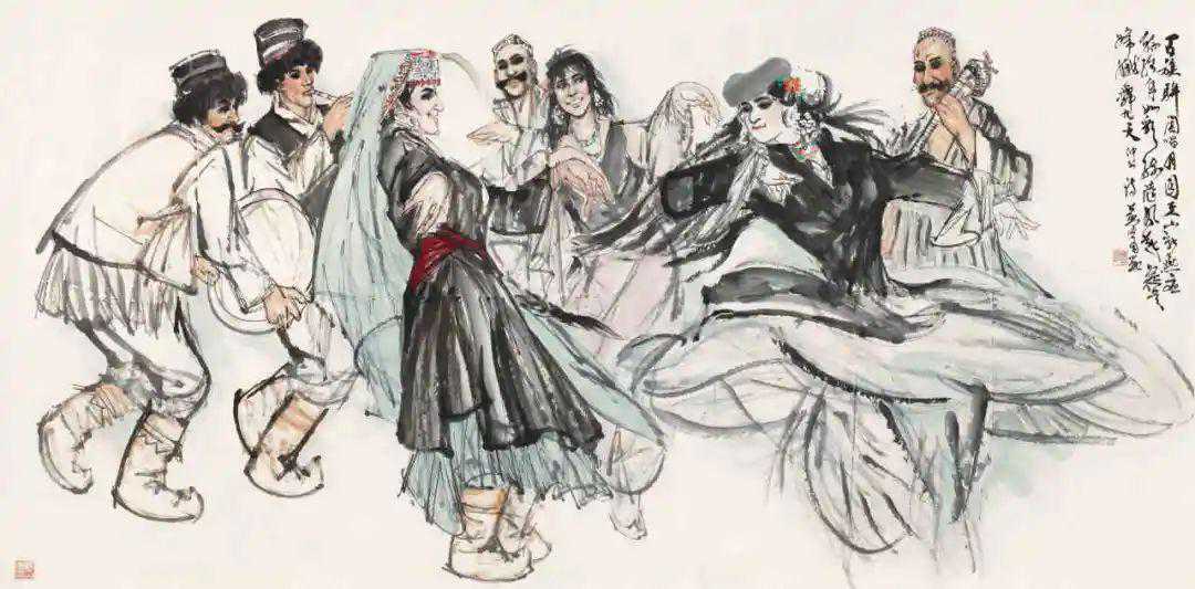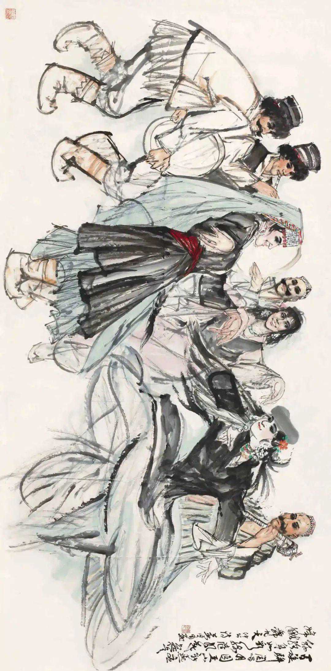 款识:百族骈阗唱月圆,天山新燕应缠绵。身如彩丝随风起,疑是嫦娥舞九天。仲公诗,黄胄画。