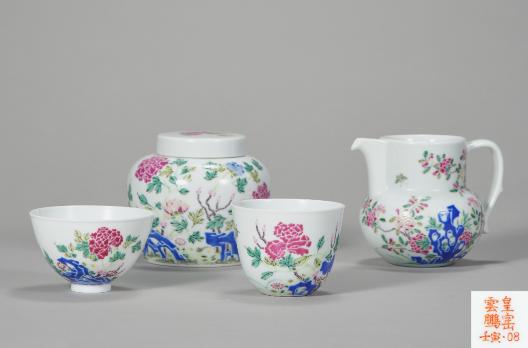 皇窑手绘没骨彩牡丹系列茶具一组四件
